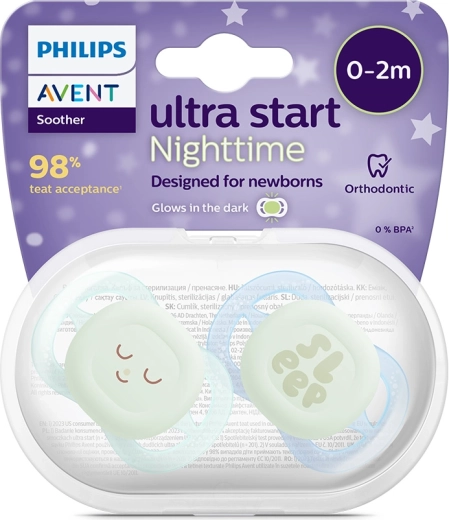 Nocny smoczek Philips Avent został zaprojektowany dla najmłodszych, 0–2 miesiące. Ultralekki i ergonomiczny, aby pasował do małych ust bez zbędnego nacisku. Świecąca przednia część sprawia, że smoczek łatwo znaleźć nawet w całkowitej ciemności, dzięki czemu nocne uspokajanie jest szybkie i bez stresu.