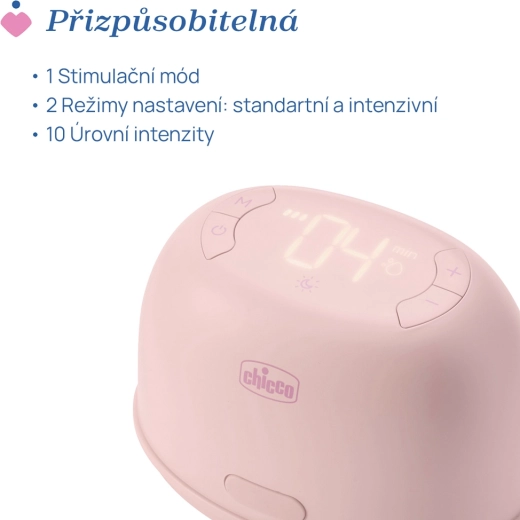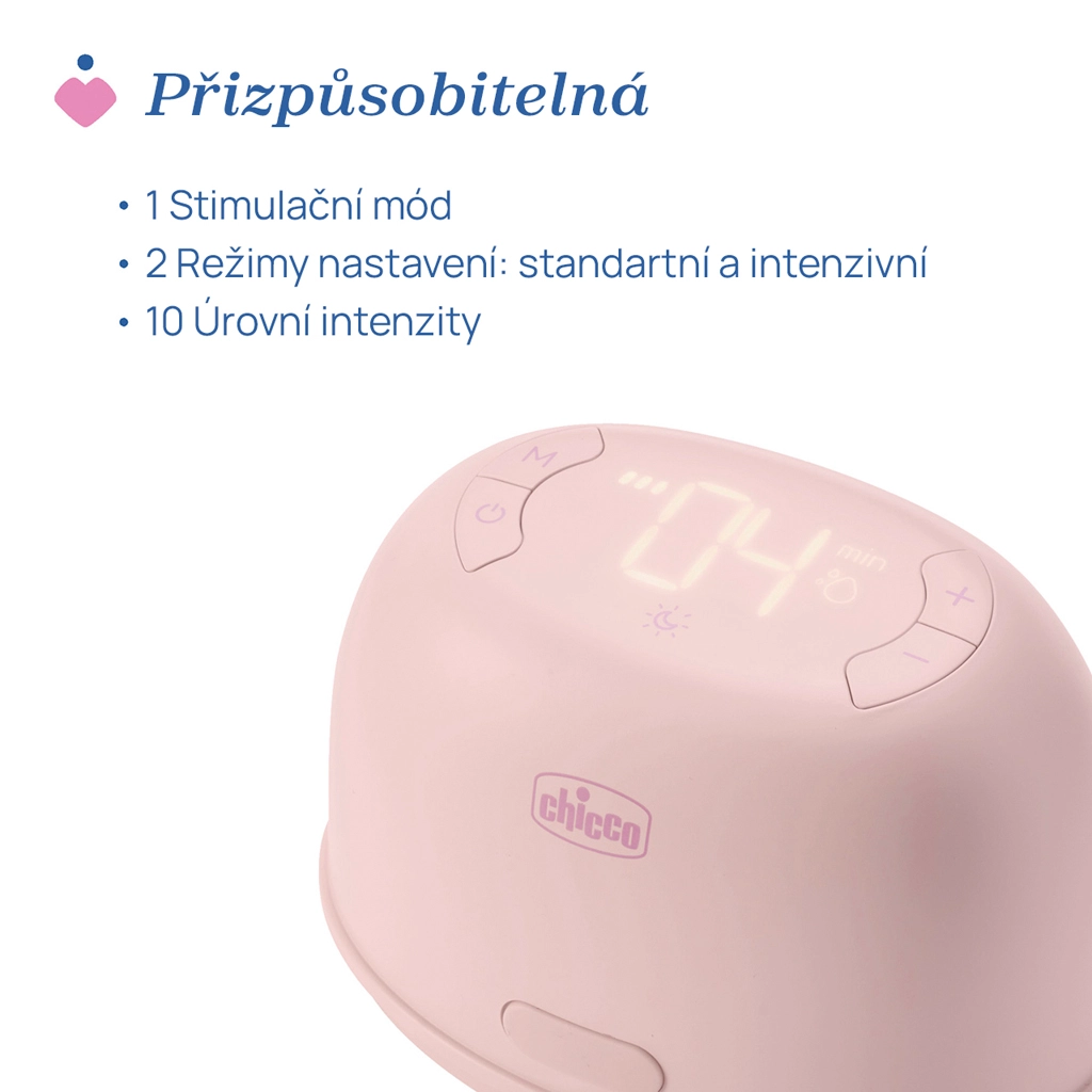 Dzięki czytelnemu cyfrowemu wyświetlaczowi i intuicyjnym przyciskom łatwo wybierzesz 1 tryb stymulacji oraz 2 tryby odciągania z nawet 10 poziomami ustawień dla każdego trybu. Obracane różowe elementy na nasadce (do 180°) pomagają w całkowitym opróżnieniu piersi. Praktyczne ładowanie USB‑C, przyjemne światło nocne oraz kompatybilność z butelkami Chicco NaturalFeeling i Well‑Being czynią z niego świetnego pomocnika w domu i w podróży.