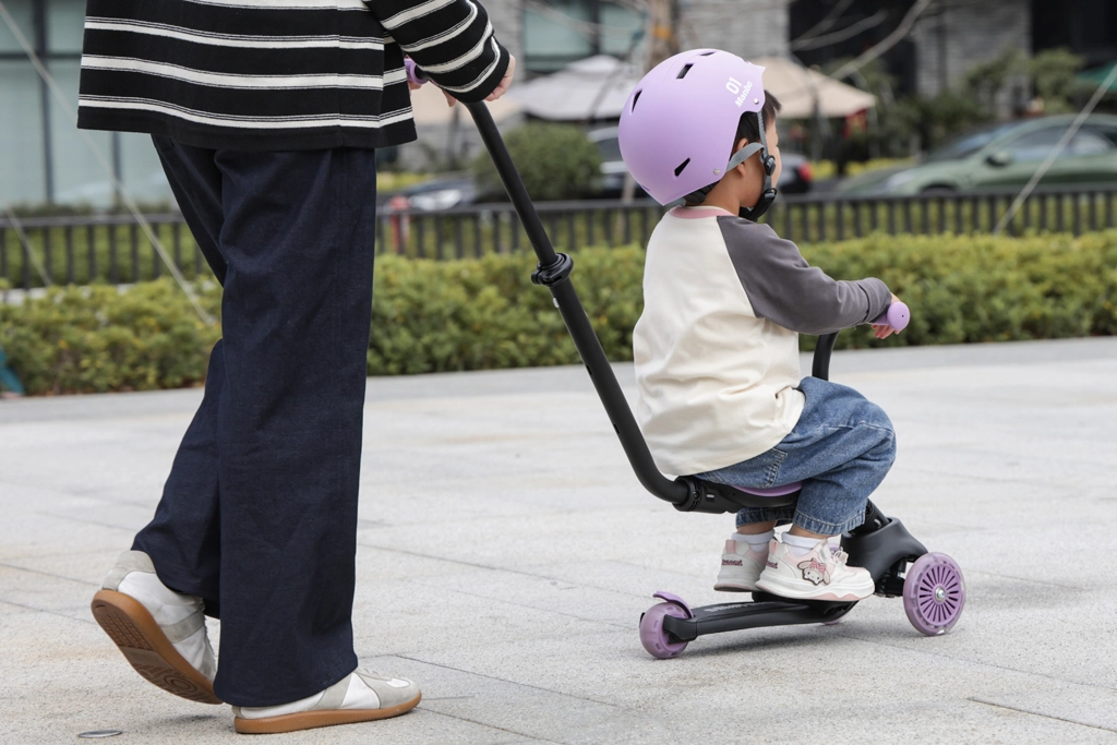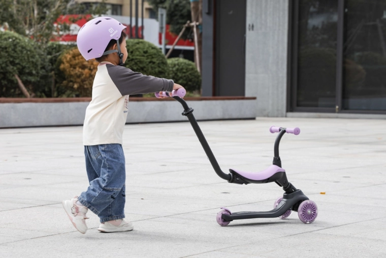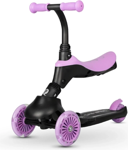 Odpinane siedzisko i rączka dla rodzica umożliwiają szybką zmianę z jazdy na siedząco na samodzielną hulajnogę, która wspiera równowagę i koordynację.