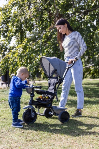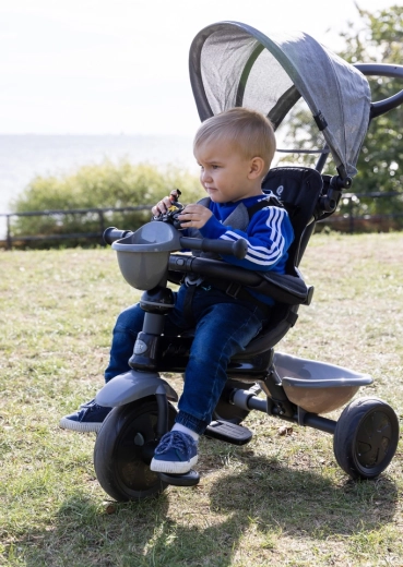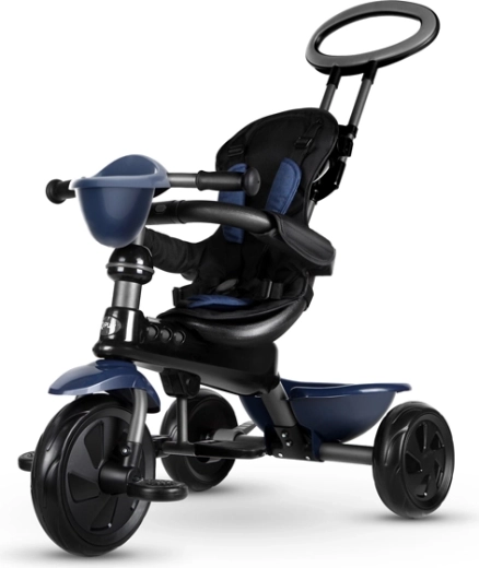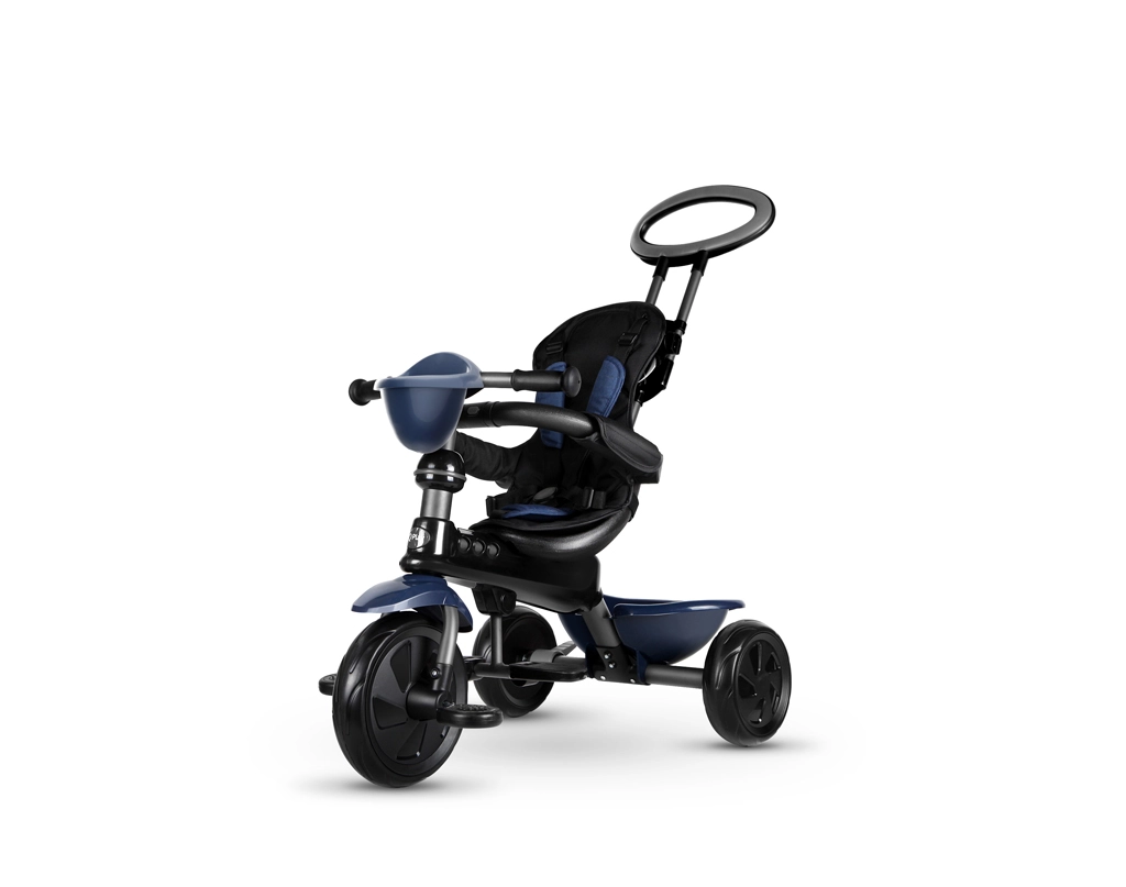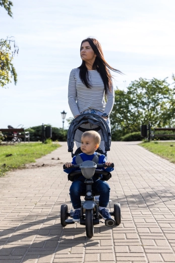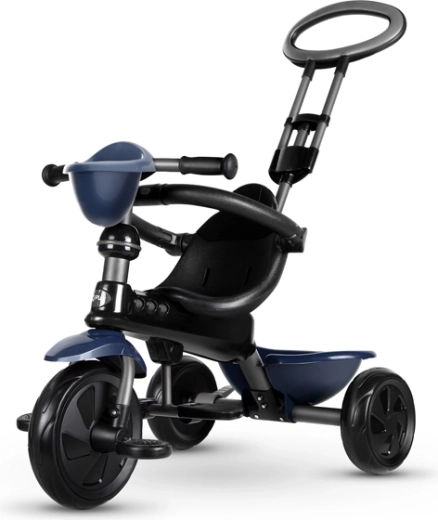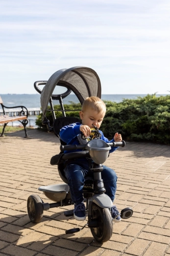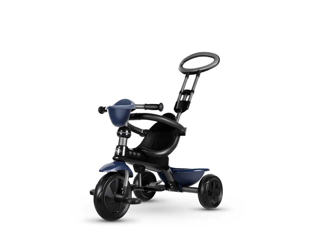 Rowerek ewoluuje w 4 krokach: od trybu w pełni sterowanego przez rodzica po samodzielną jazdę na pedałach. Odłączane elementy (oparcie, rączka rodzica, podnóżki/pedały) umożliwiają idealne dopasowanie na każdym etapie wzrostu. Praktyczny przedni koszyk na butelkę i tylny kosz zapewniają miejsce na zabawki i drobiazgi, a tylna nożna hamulec postojowy gwarantuje bezpieczne parkowanie.