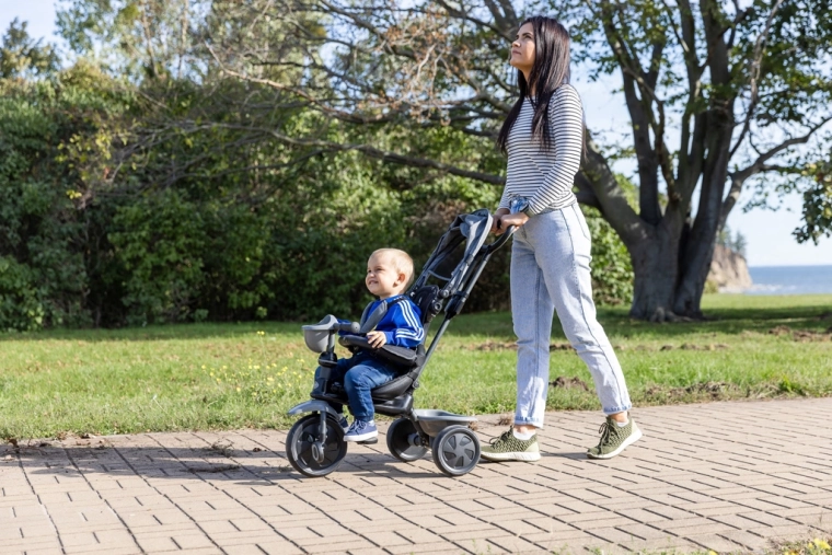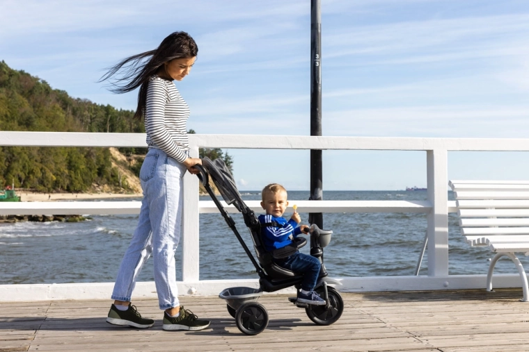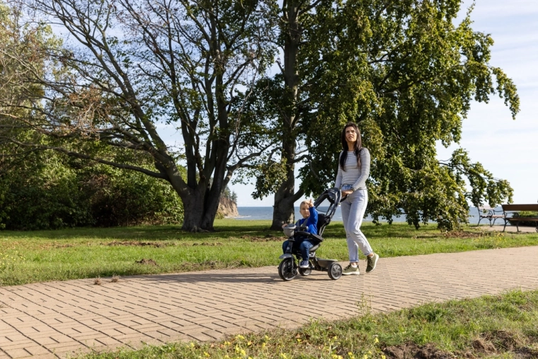 - Wygodne prowadzenie: regulowana na wysokość rączka rodzica i kółka z EVA dla płynnej jazdy.