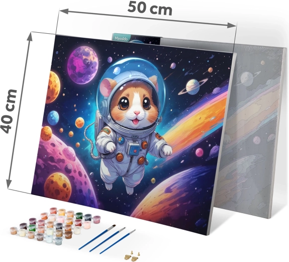 Odkryj radość tworzenia z kreatywnym zestawem malowania po numerach na płótnie 40 × 50 cm. Wzór Astronauta zachwyci dzieci i dorosłych, płótno na ramie jest wstępnie przygotowane do malowania, w opakowaniu znajdziesz do 30 kryjących farb, 3 pędzle o różnej grubości oraz haczyki do zawieszenia. Idealny dla początkujących i zaawansowanych – wystarczy podążać za numerami, aby stworzyć żywy, kolorowy obraz z kosmicznym motywem.