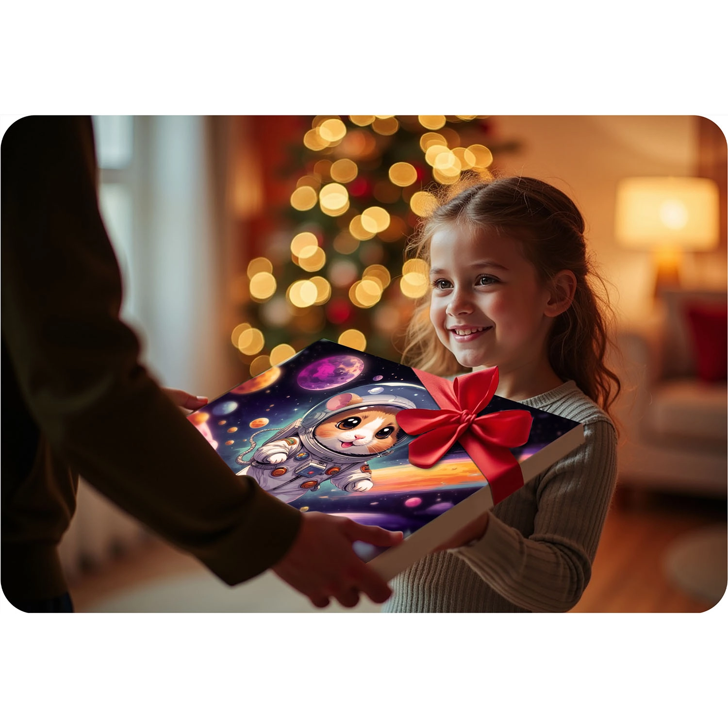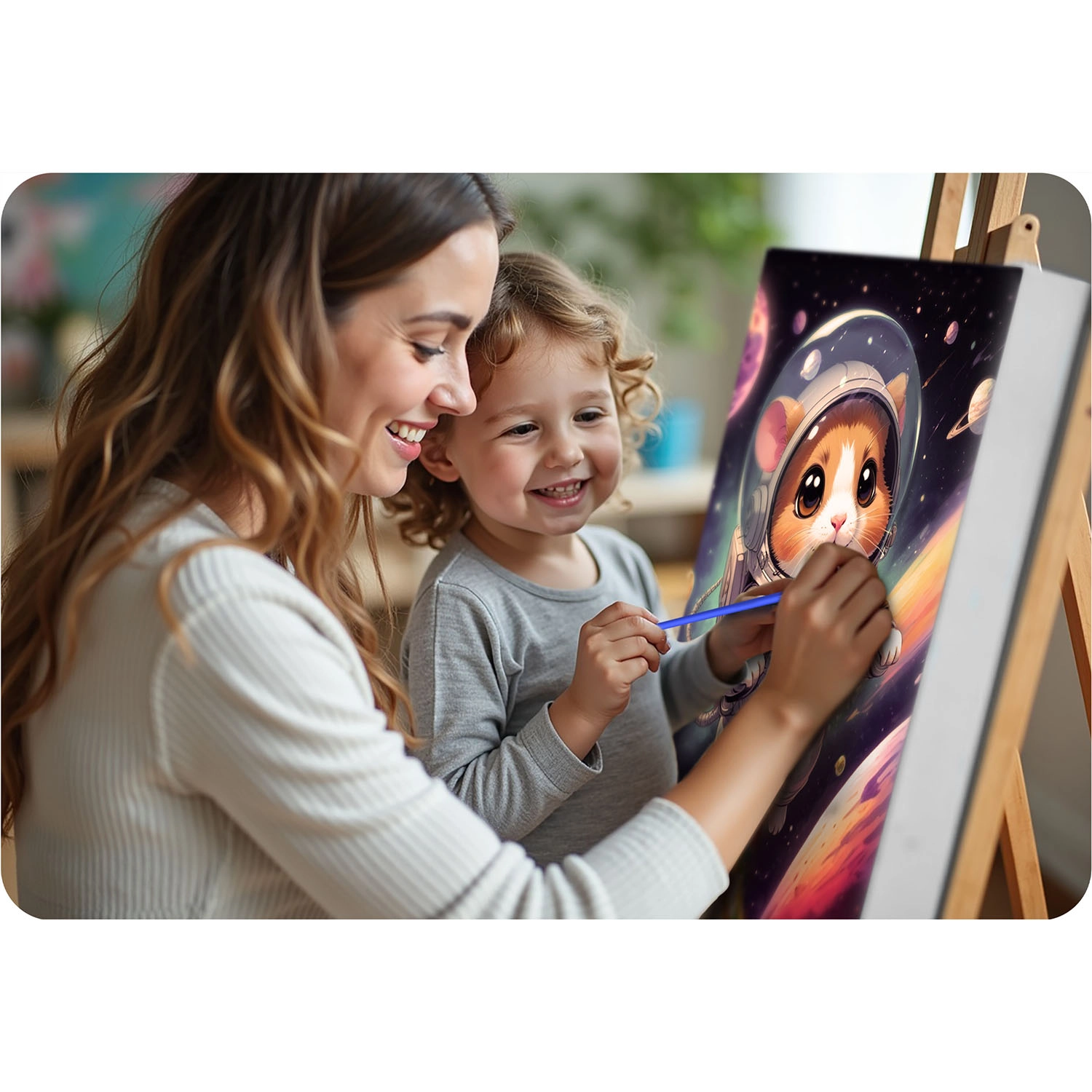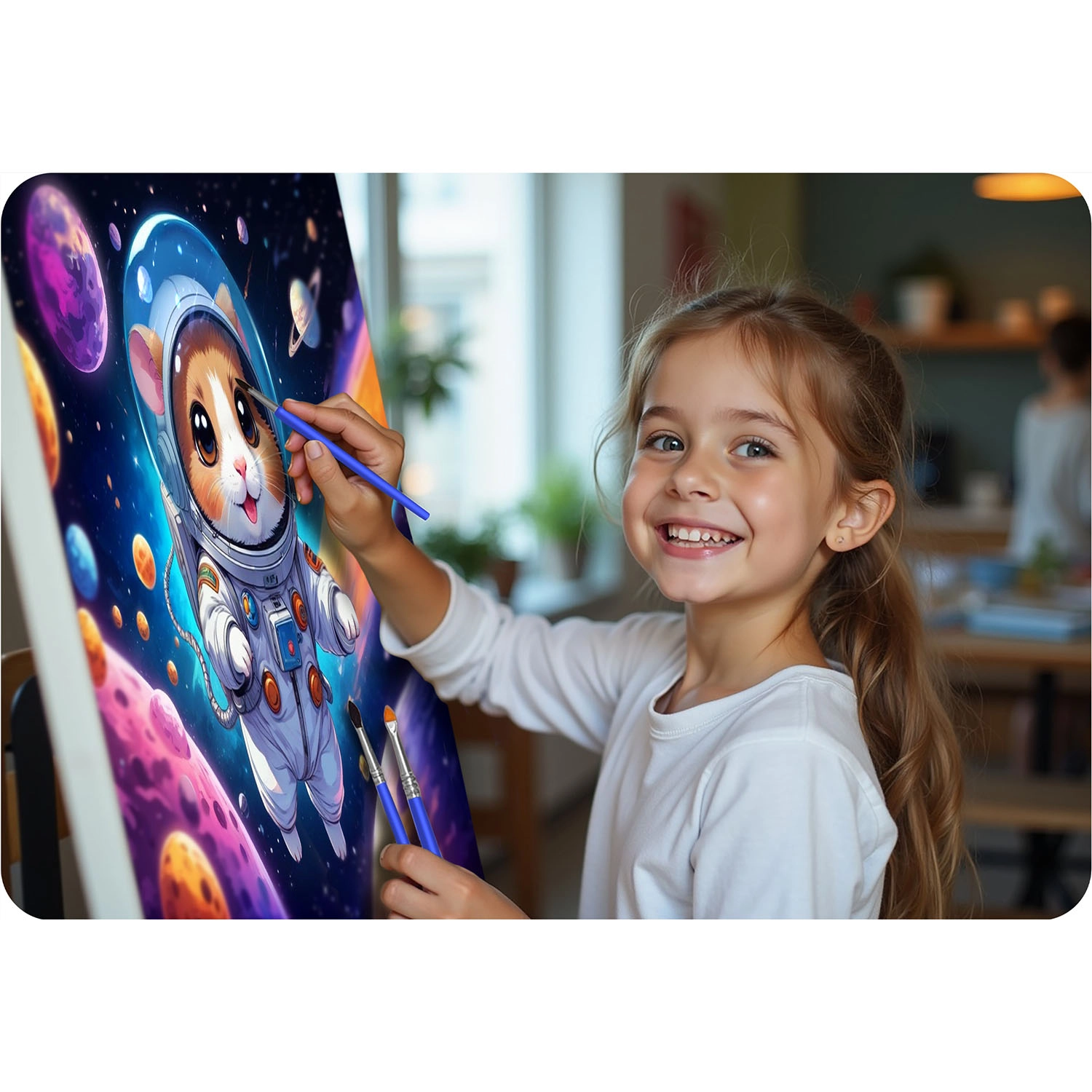 Ten zestaw do malowania po numerach zawiera wszystko, czego potrzebujesz, aby stworzyć przyciągający wzrok obraz z motywem uroczego astronauty wśród planet. Wysokiej jakości płótno na naciągniętej ramie jest zagruntowane i posiada nadrukowane, delikatnie oznaczone pola ułatwiające prowadzenie pędzla. Kolorowy podkład ułatwia orientację i pomaga osiągnąć nasycone efekty nawet całkowitym początkującym.