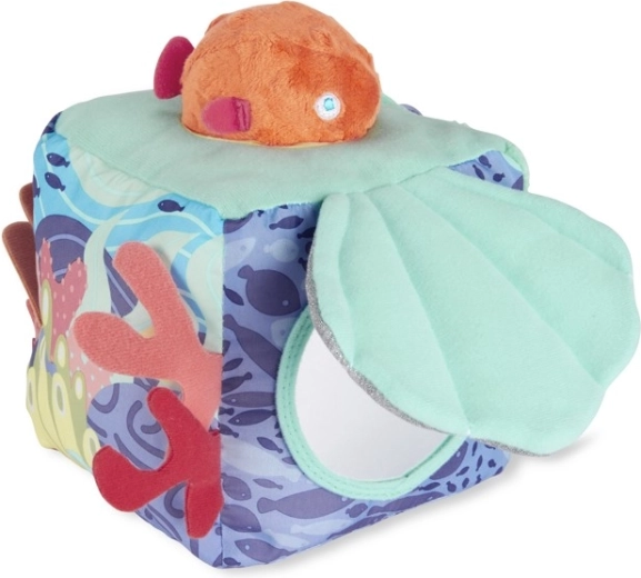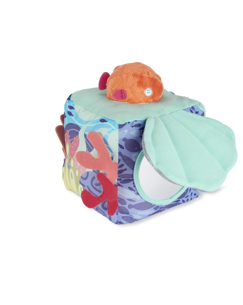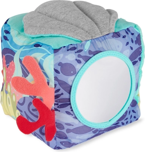 Ta mięciutka aktywna kostka z motywem oceanu dostarcza maluchom wielu bodźców do zabawy sensorycznej. Rybka-grzechotka, miękka szeleszcząca muszla z ukrytym lusterkiem i zróżnicowane powierzchnie zachęcają do chwytania, ugniatania i badania.
