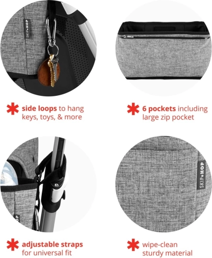 Praktyczny organizer do wózka Skip Hop Grab & Go Ultra w stylowym wykończeniu szary melange oferuje sześć kieszeni, dużą kieszeń na zamek oraz boczne pętelki na klucze lub zabawki. Dzięki regulowanym paskom łatwo przymocujesz go do większości wózków, a solidny, łatwy do czyszczenia materiał utrzyma wszystko bezpiecznie i pod ręką.
