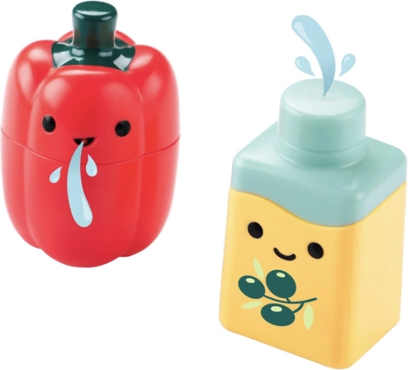 Urocze buteleczki w kształcie papryki i oliwy działają jak spryskiwacze. Dwuczęściowa konstrukcja ułatwia czyszczenie i utrzymanie zabawek w higienie.