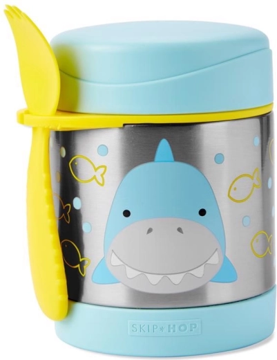 Praktyczny dziecięcy termos na jedzenie SKIP HOP z zabawnym motywem rekina utrzymuje porcję ciepłą do 7 godzin i zimną do 5 godzin. Dzięki podwójnej ściance z nierdzewnej stali, szerokiemu wlewowi ułatwiającemu nabieranie i czyszczenie oraz zintegrowanemu łyżkowidelcu jest idealny w podróży, do przedszkola i na wycieczki. Bez BPA, PVC i ftalanów.