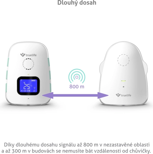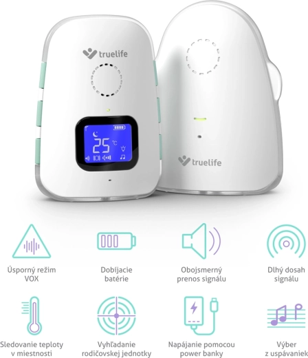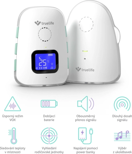 TrueLife NannyTone VM3 to niezawodna cyfrowa niania audio, która zapewnia niezakłócony podgląd tego, co dzieje się w pokoju dziecka. Stabilną i bezpieczną transmisję dźwięku z zasięgiem do 800 m w otwartej przestrzeni i do 300 m w budynku uzupełnia czuły tryb VOX, który aktywuje nianię tylko po wykryciu dźwięku, oszczędzając tym samym baterię. Dzięki komunikacji dwukierunkowej możesz uspokoić dziecko na odległość oraz wybrać jedną z 8 kołysanek z regulacją głośności.