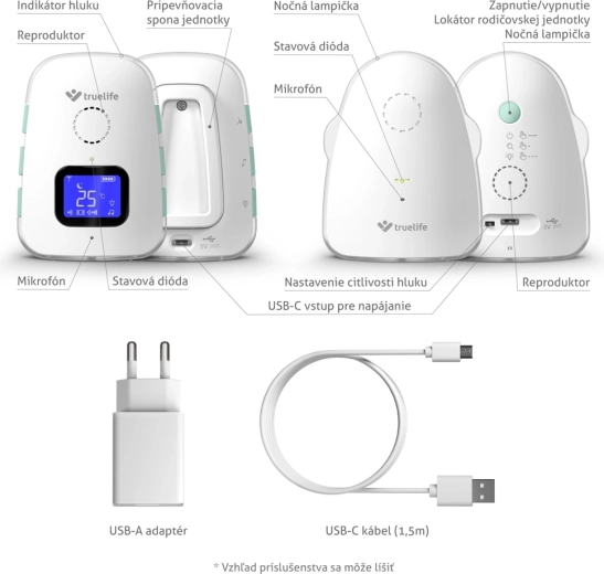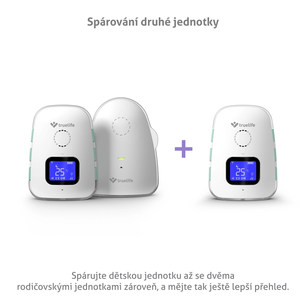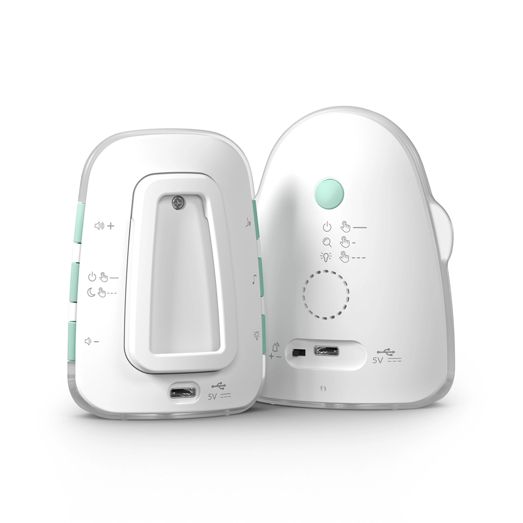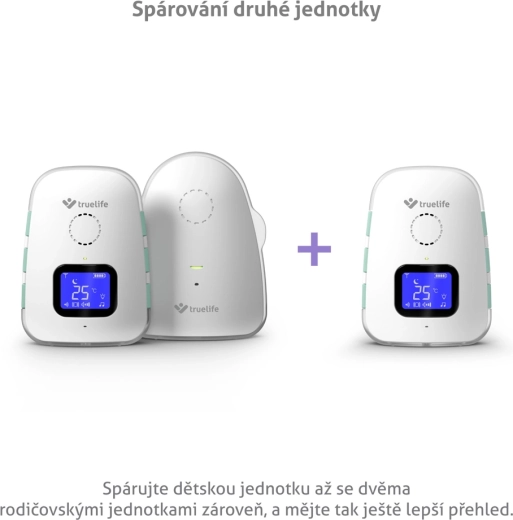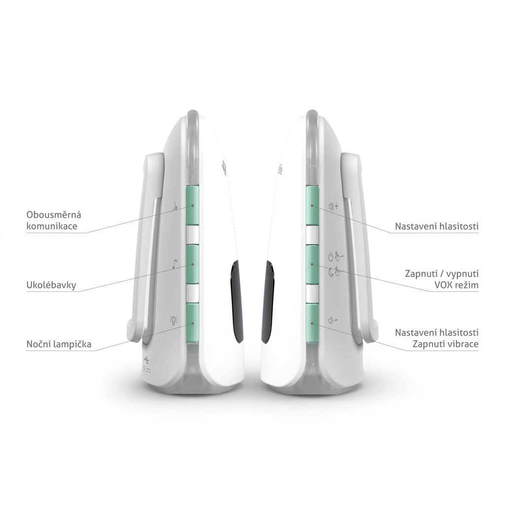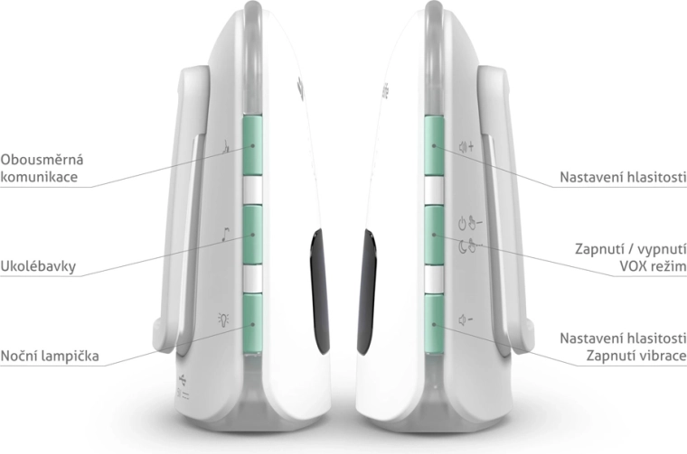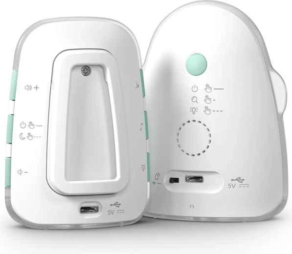 Jednostka rodzica z wyświetlaczem LCD pokazuje temperaturę, stan baterii i siłę sygnału. Do dyspozycji jest kontrola temperatury z alertami o niskiej lub wysokiej temperaturze, tryb cichy z wibracjami, praktyczna lampka nocna oraz sygnał dźwiękowy lokalizujący jednostkę rodzica. Obie jednostki mają zintegrowane akumulatory o długiej żywotności i wygodne ładowanie przez USB‑C, ewentualnie z powerbanku.