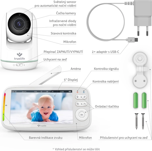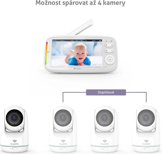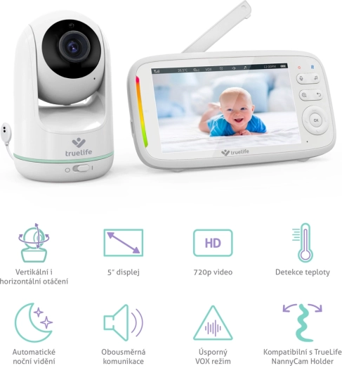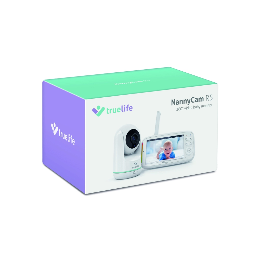TrueLife NannyCam R5 to niezawodna niania wideo dla nowoczesnych rodziców. Obrotowa kamera z zakresem poziomym 330° i pionowym 135° w połączeniu z obiektywem szerokokątnym obejmie cały pokój, a rozdzielczość HD 720p zapewnia czysty i ostry obraz na 5" wyświetlaczu IPS LCD. Automatyczne widzenie nocne z diodami podczerwieni włącza się samoistnie, dzięki czemu zobaczysz dziecko nawet w całkowitej ciemności.