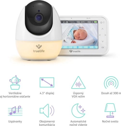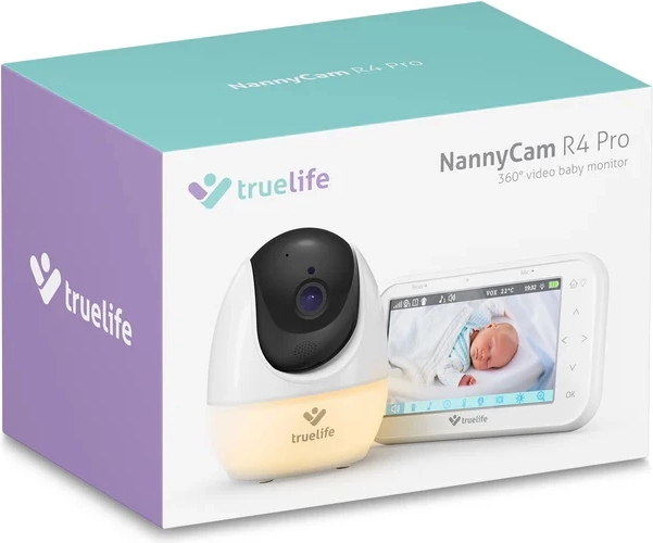 Niezawodna niania wideo TRUELIFE NannyCam R4 Pro oferuje pokrycie 360° dzięki obrotowej kamerze, ekran 4,3" IPS z czystym obrazem, zasięg do 300 m, automatyczne widzenie nocne, tryb VOX z czasem pracy do 17 godzin, komunikację dwukierunkową, nocne światło, 8 kołysanek oraz pomiar temperatury. Idealna do spokojnego monitoringu w domu i w ogrodzie.
