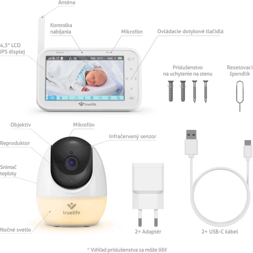 - 1× kamera (jednostka dziecięca), 1× jednostka rodzicielska, 2× zasilacz sieciowy, 2× kabel USB-C, 1× szpilka resetująca, 1× instrukcja