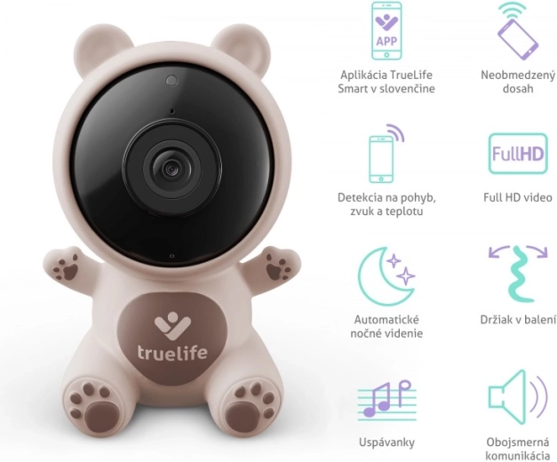 TrueLife NannyCam S3 Smart to elegancka niania wideo w formie misia, która naturalnie komponuje się z pokojem dziecka. Oferuje krystalicznie czysty obraz Full HD z kątem widzenia 100° oraz automatyczne widzenie nocne do 5 metrów. Po wykryciu ruchu, dźwięku lub zmiany temperatury natychmiast Cię powiadomi. Dzięki komunikacji dwukierunkowej możesz uspokoić malucha własnym głosem lub włączyć kołysanki, a delikatne światło lampki nocnej stworzy przytulną atmosferę.