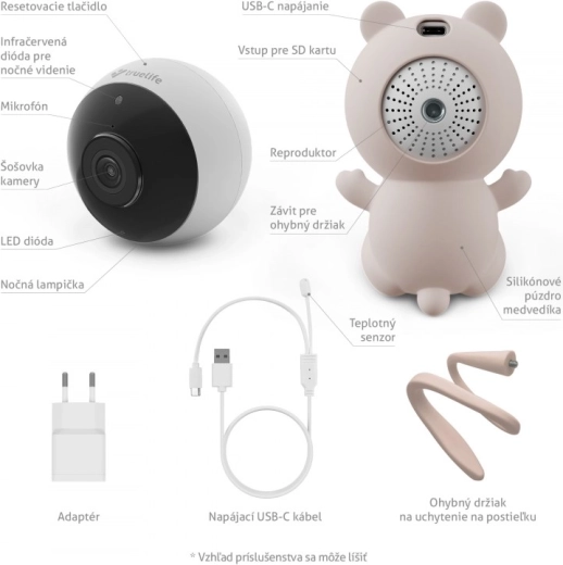 - Inteligentna kamera NannyCam S3, silikonowe etui w kształcie misia, kabel USB‑C z czujnikiem temperatury, zasilacz, elastyczny uchwyt do łóżeczka, instrukcja i wskazówki bezpieczeństwa, szpilka do resetu
