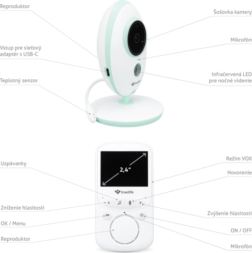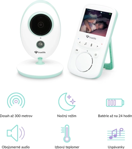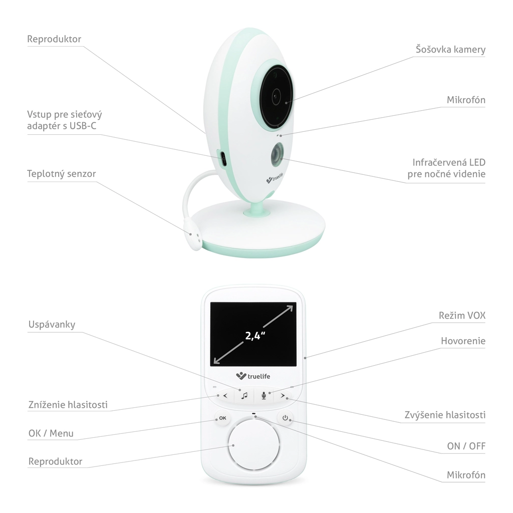 Cyfrowa niania wideo TRUELIFE NannyCam V24 Pro oferuje czysty obraz w dzień i w nocy, przejrzysty 2,4" kolorowy ekran LCD, stabilną transmisję 2,4 GHz do 300 m oraz komunikację dwukierunkową. Dzięki trybowi VOX jednostka rodzica działa na baterii nawet 24 godziny. Do dyspozycji jest tryb nocny, pomiar temperatury w pokoju, kołysanki oraz nowoczesne ładowanie USB‑C z obsługą powerbanku.