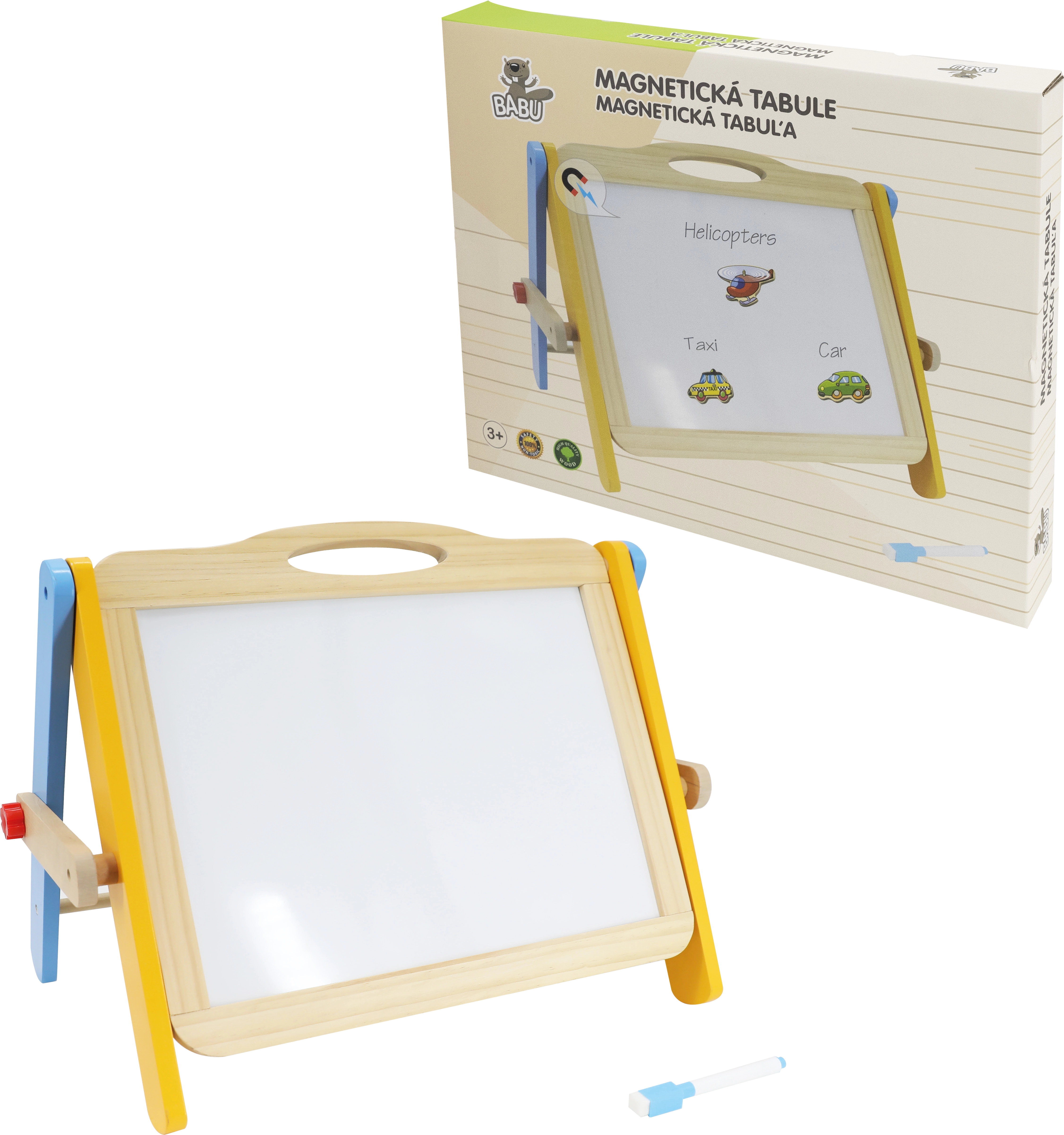 Wspieraj dziecięcą kreatywność i naukę z dwustronną drewnianą tablicą BABU. Jedna strona służy do pisania kredą, druga jest magnetyczna – idealna do rozwijania wyobraźni, małej motoryki i zabaw z literkami. W zestawie znajduje się komplet kred i magnetycznych literek do natychmiastowej zabawy. Dwustronne użytkowanie, powierzchnia magnetyczna, solidne drewniane wykonanie oraz nauka przez zabawę od 3 lat.