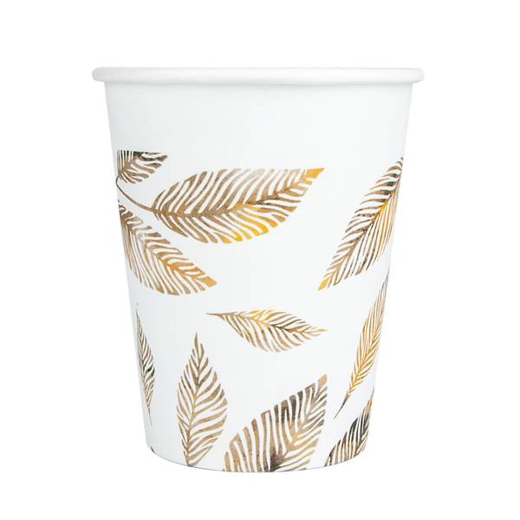 Eleganckie papierowe kubeczki z delikatnym motywem gałązek w szarym kolorze są idealne na przyjęcia, wesela oraz do codziennego użytku. Oferują praktyczną pojemność 200 ml, są lekkie i wytrzymałe i doskonale pasują do nowoczesnej aranżacji stołu. Opakowanie zawiera 8 sztuk.