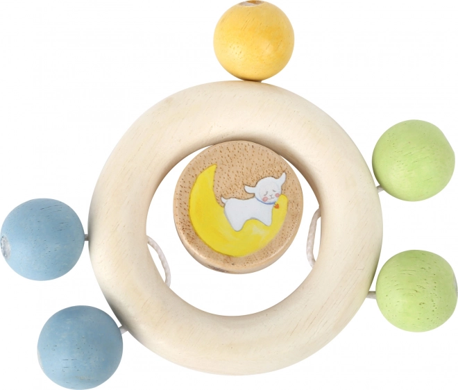 Drewniana grzechotka Lotta to idealna zabawka dla najmłodszych, która stymuluje zdolności motoryczne i słuch dzięki koralikom grzechoczącym o obręcz.