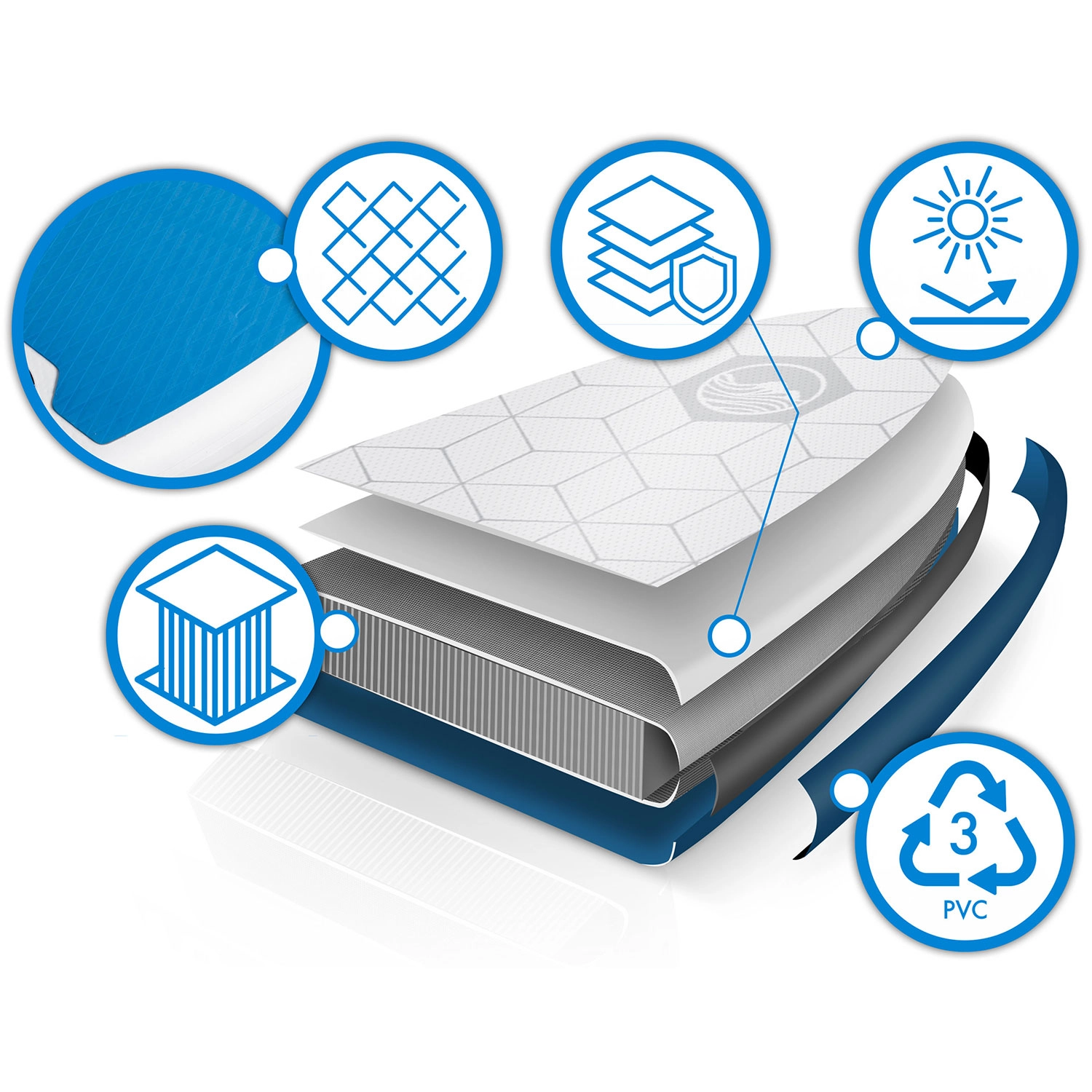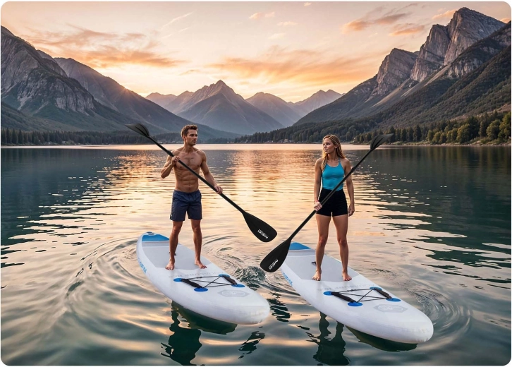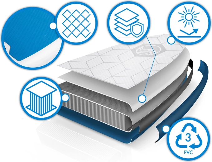 Wielowarstwowe PVC, gęste włókna Drop Stitch i wzmocnione szwy zapewniają wysoką sztywność, odporność na UV i długą żywotność. Antypoślizgowa mata EVA dla pewnej pozycji.