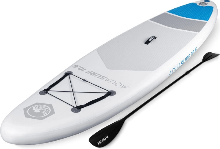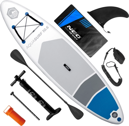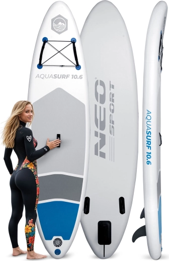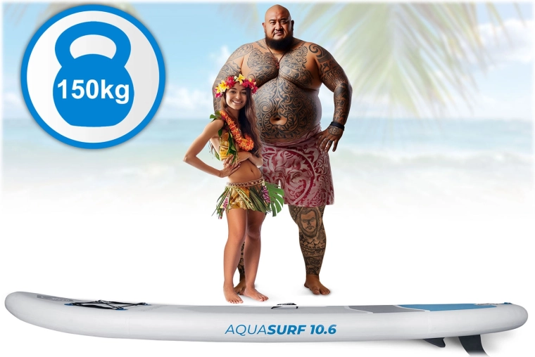 AQUASURF 10'6 to uniwersalny nadmuchiwany SUP do rekreacyjnego wiosłowania, fitnessu oraz wycieczek po jeziorach i spokojnych rzekach. Dzięki szerokości 84 cm oferuje doskonałą stabilność, objętość 318 l uniesie użytkownika do 150 kg, a antypoślizgowa mata EVA dodaje pewności przy każdym kroku. Trzy wygodne uchwyty ułatwiają manewrowanie na brzegu i na wodzie.