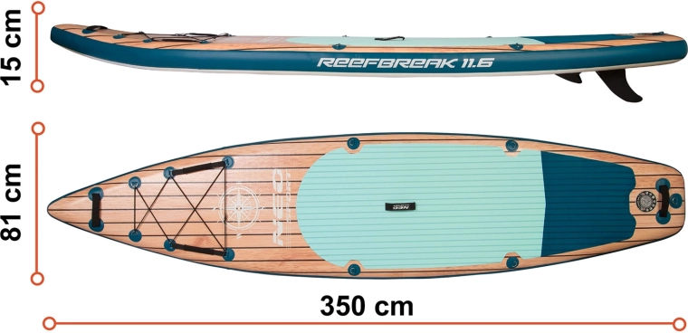 Reefbreak 350 to uniwersalny SUP do rekreacyjnego pływania, wycieczek i ćwiczeń na wodzie. Trójwarstwowe PVC z podwójną tkaniną Drop Stitch, wzmocnione szwy oraz zintegrowane wzmocnienie krawędzi z włókna węglowego zapewniają wyjątkową sztywność bez zbędnej masy. Dzięki szerokości 81 cm deska jest stabilna dla początkujących i zaawansowanych, a przy tym zachowuje żwawość i dobrą trakcję.