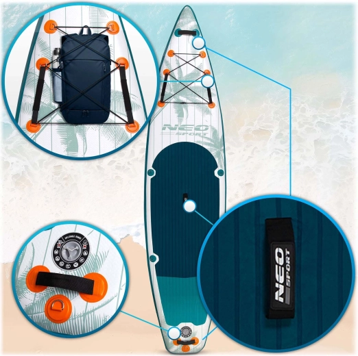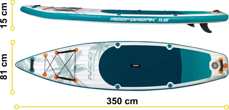 Neo-Sport Reefbreak to nadmuchiwana deska SUP zaprojektowana do rekreacyjnego pływania, całodziennych wycieczek oraz pierwszych prób na wodzie. Dzięki wymiarom 350 × 81 × 15 cm zapewnia świetną stabilność i pewność początkującym, a jednocześnie wystarczającą prędkość i trzymanie kierunku dla bardziej zaawansowanych użytkowników. Lekka, a zarazem sztywna konstrukcja Drop Stitch Light gwarantuje wysoką odporność oraz łatwą obsługę podczas przenoszenia i przechowywania.