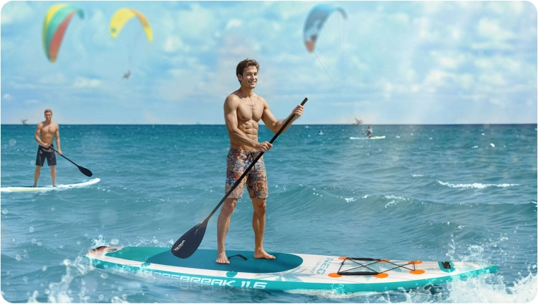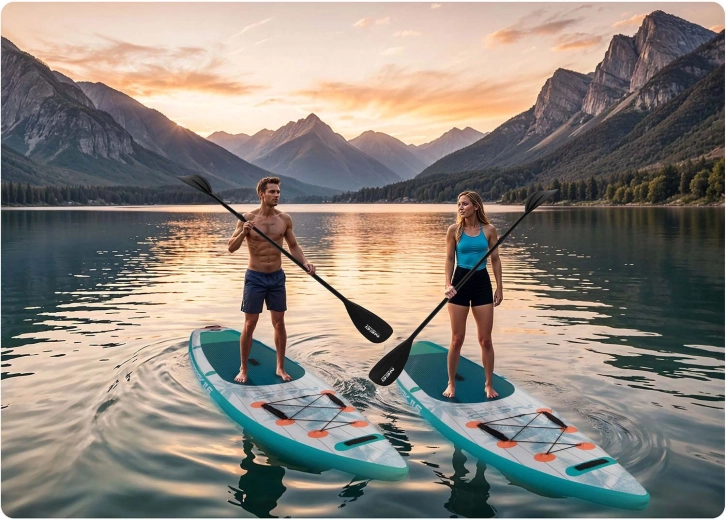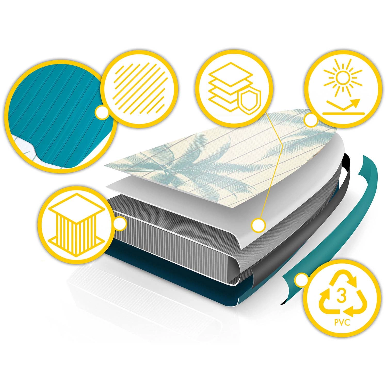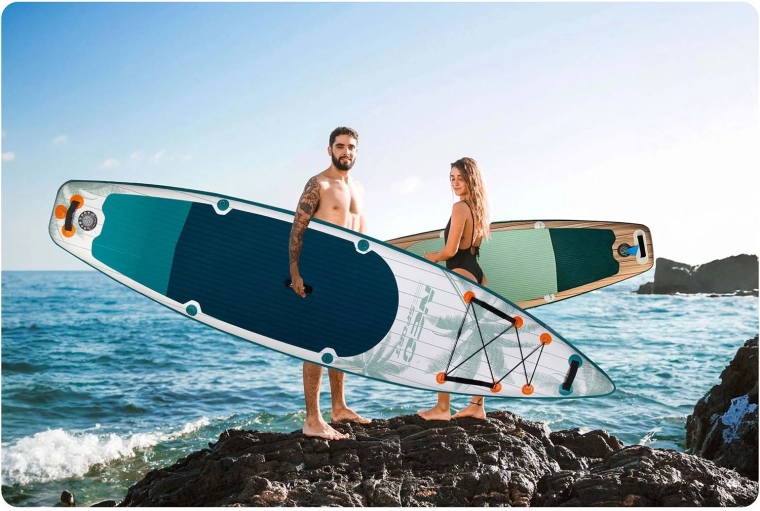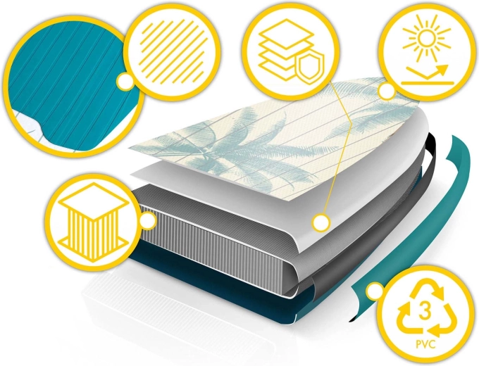 Wielowarstwowe PVC z rdzeniem drop-stitch zapewnia wysoką sztywność, odporność i długą żywotność, przy jednoczesnym zachowaniu niskiej masy dla łatwego przenoszenia.