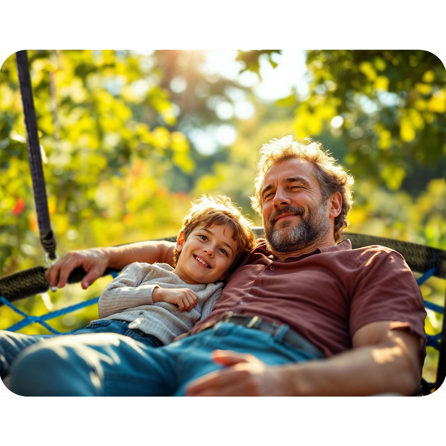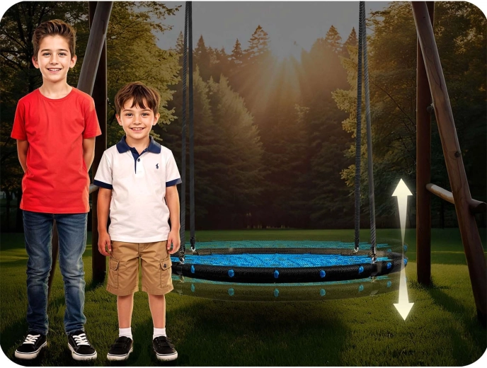 Solidne liny PE są odporne na promieniowanie UV i zużycie mechaniczne, co wydłuża żywotność nawet przy codziennym użytkowaniu. Regulowana wysokość w zakresie około 90–160 cm pozwala dopasować huśtawkę do wieku i wzrostu dziecka, zapewniając bezpieczne wsiadanie oraz wygodne bujanie.