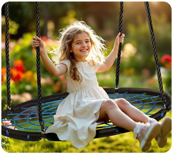 Odkryj przestronną, okrągłą huśtawkę typu bocianie gniazdo o średnicy 120 cm marki NEO-SPORT – idealną dla dzieci i dorosłych. Dzięki stalowej ramie w oplocie PE, wytrzymałej, siatkowej powierzchni siedziska oraz regulowanym linom zawieszenia zapewnia bezpieczne i komfortowe bujanie w ogrodzie. Materiał z odpornego PE łatwo się czyści, jest wodoodporny oraz odporny na promieniowanie UV i ścieranie. Maksymalne obciążenie do 150 kg gwarantuje mnóstwo zabawy dla kilku użytkowników jednocześnie.