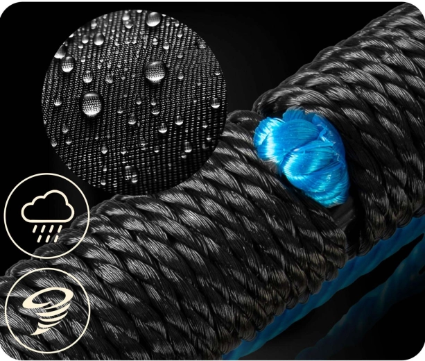 Solidna stalowa rama w ochronnym oplocie PE oraz mocne, plecione liny zapewniają stabilność, długą żywotność i odporność na wodę, promieniowanie UV oraz ścieranie.