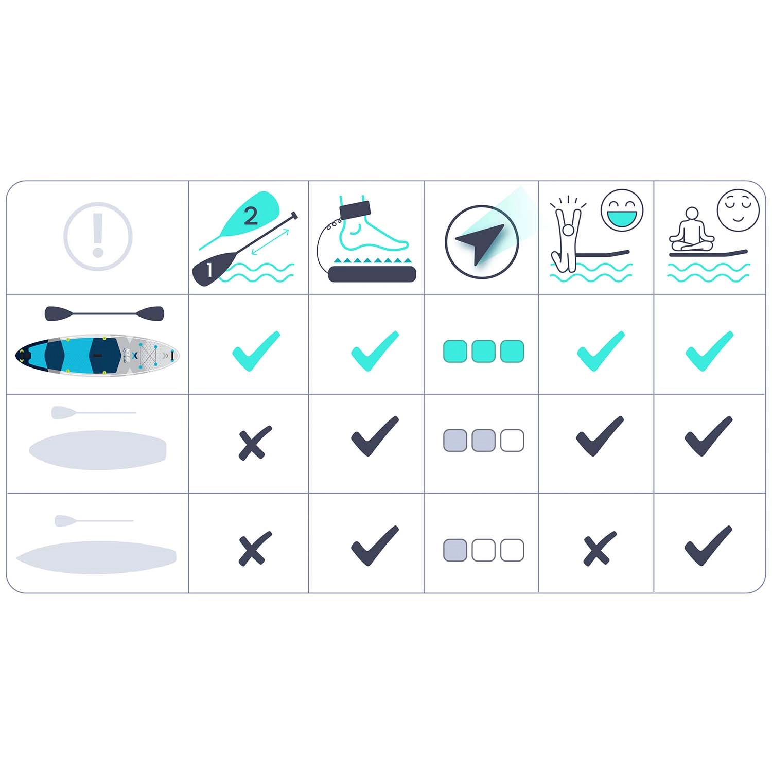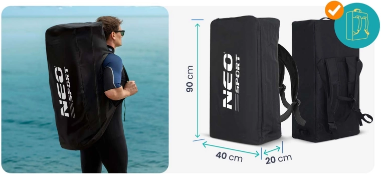 Kompletny zestaw oszczędza czas i miejsce: dwutłokowa pompka z manometrem do szybkiego i bezpiecznego pompowania, regulowane wiosło 162–210 cm z szybkozamykającą blokadą, leash z obrotowym przegubem przeciw skręcaniu, mocny system bungee na dziobie na plecak lub kurtkę oraz wytrzymały plecak transportowy dla wygodnego przenoszenia. 3‑warstwowe PVC z ochroną UV oraz wzmocnione krawędzie zwiększają trwałość i odporność na uderzenia.
