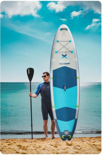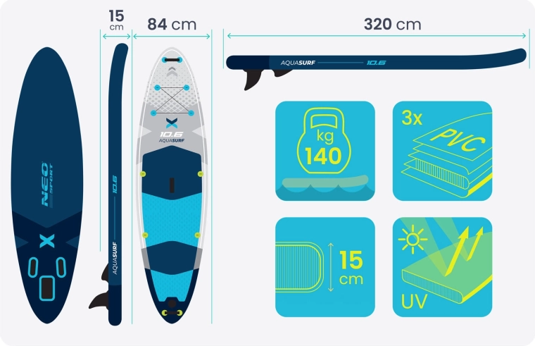 Deska SUP AQUASURF 10’6 oferuje idealne połączenie stabilności, zwrotności i wytrzymałości. Dzięki grubości 15 cm i nośności do 140 kg świetnie sprawdzi się dla początkujących i zaawansowanych, do relaksu, fitnessu oraz jogi na wodzie. Antypoślizgowa pianka EVA pewnie trzyma stopy nawet na mokro, a trzy finy (główny zdejmowany + boczne) poprawiają trzymanie kursu i stabilność w linii prostej.