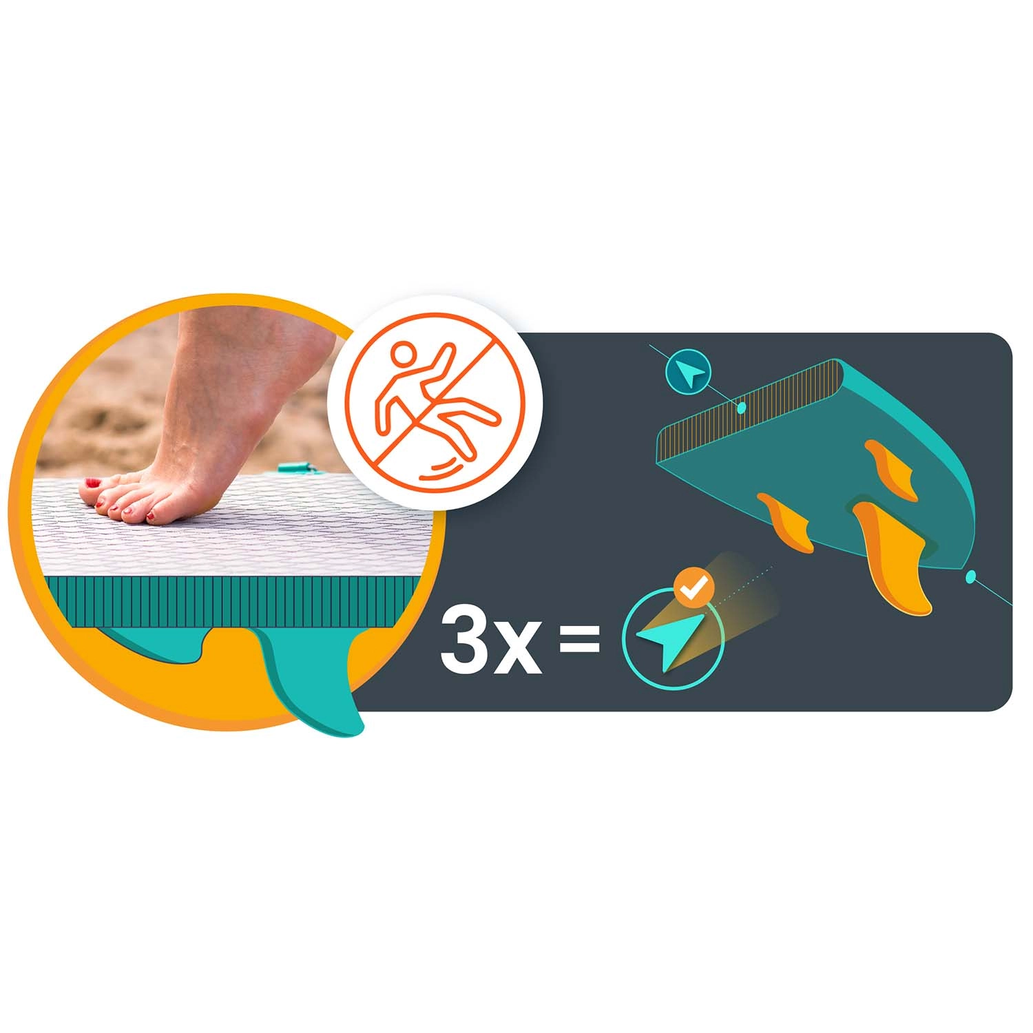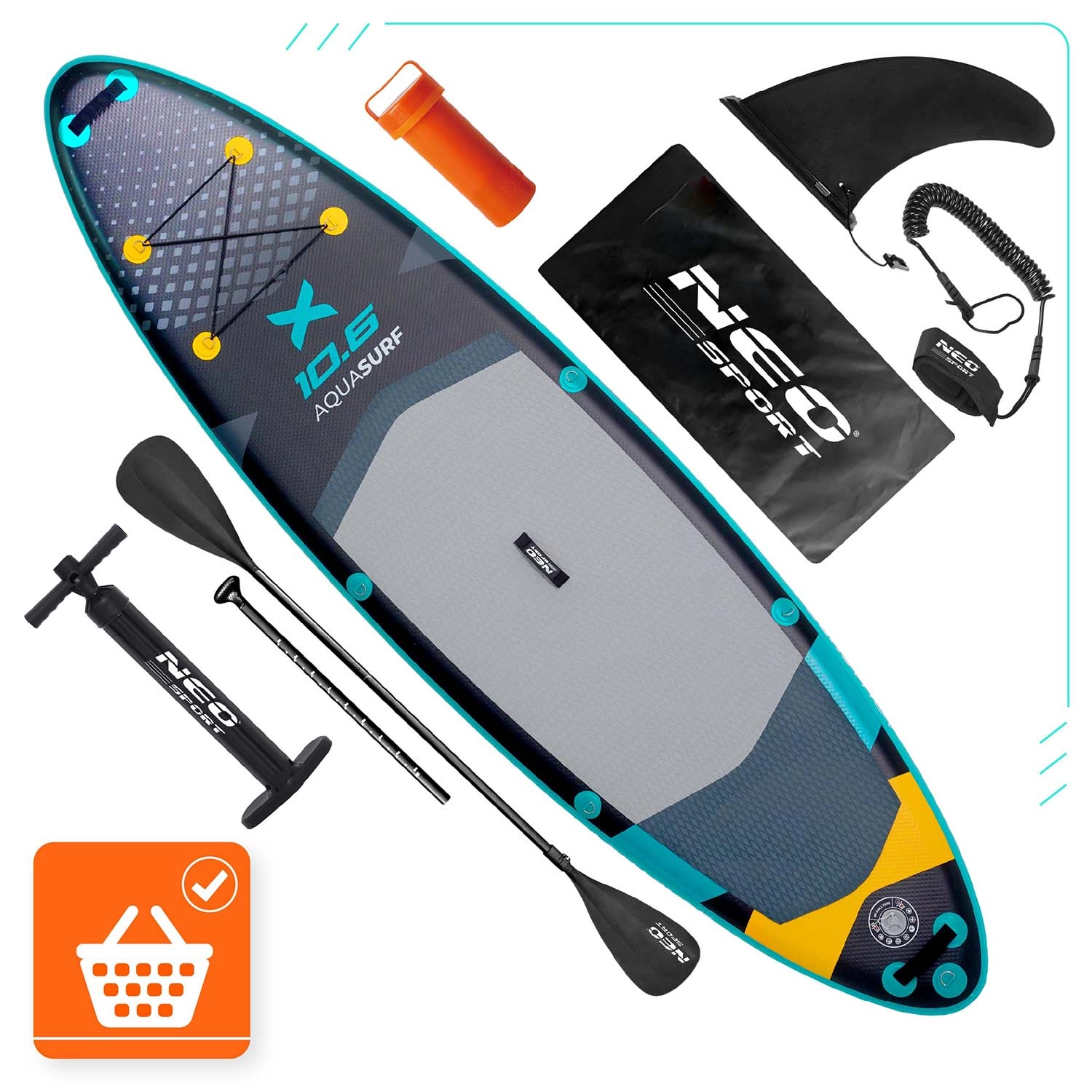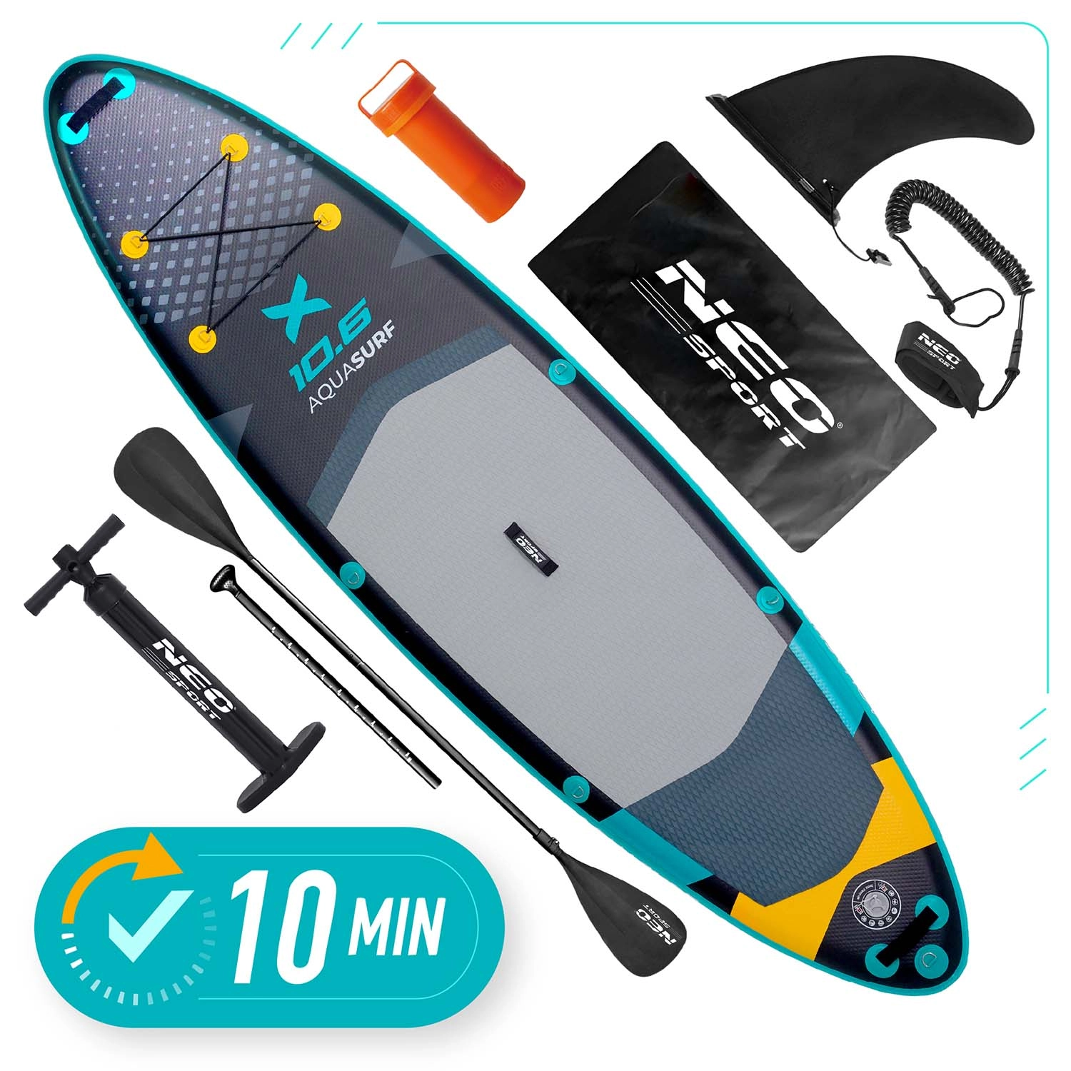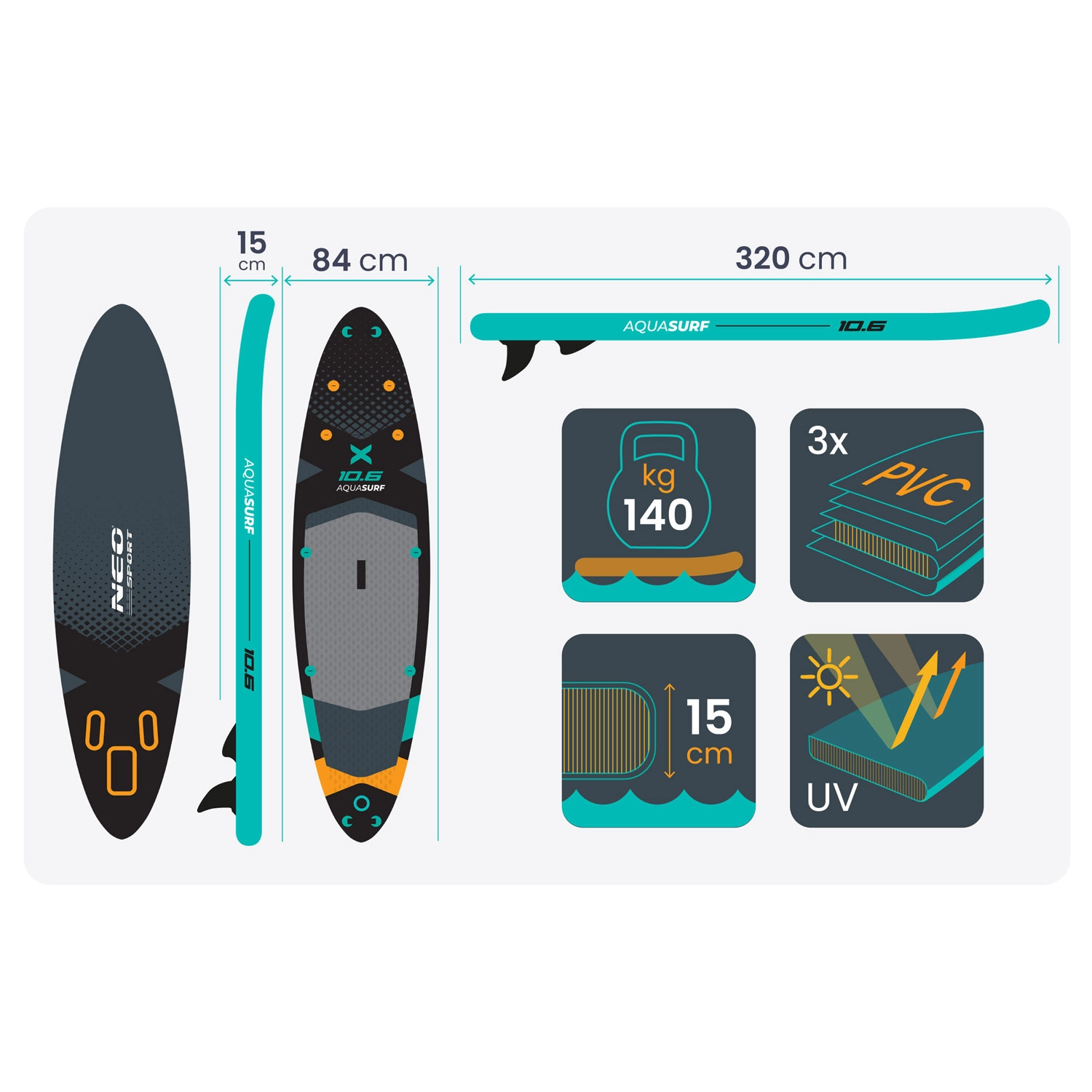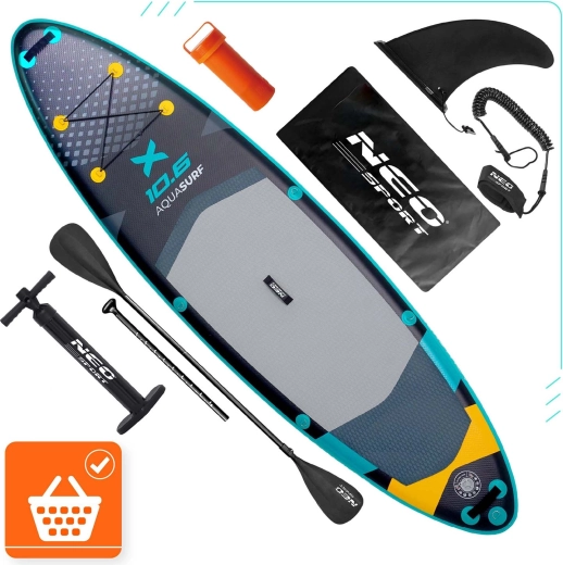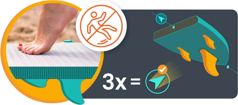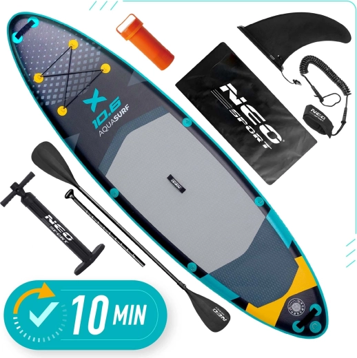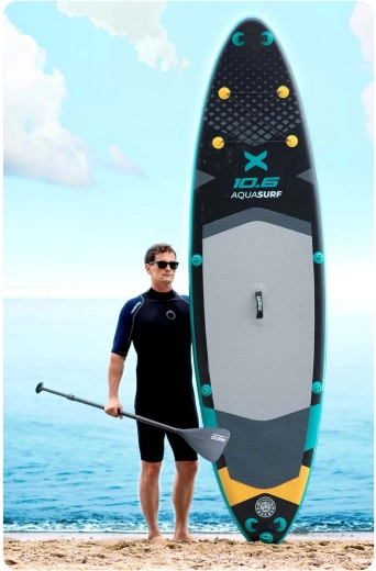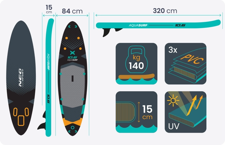 Paddleboard Aquasurf 10’6 został zaprojektowany z myślą o pewnym stanie pod stopami i komforcie na każdej wyprawie. Szeroka powierzchnia do stania, grubość 15 cm i trzy stateczniki zapewniają spokojną jazdę i łatwe manewrowanie. Antypoślizgowa EVA mata trzyma nawet mokre stopy, a zintegrowane bungee linki na pokładzie bezpiecznie utrzymają plecak, butelkę lub kurtkę.
