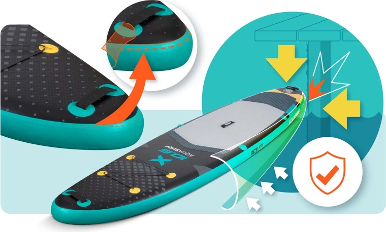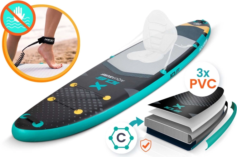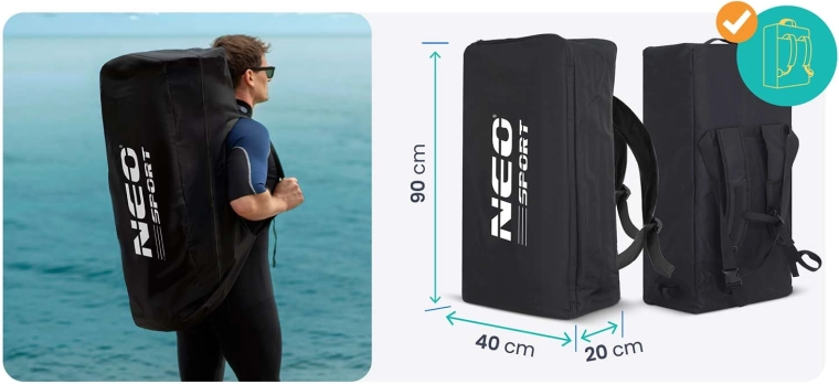 W zestawie znajdziesz wszystko, czego potrzebujesz: regulowane aluminiowe wiosło (162–210 cm), dwukierunkową pompkę z manometrem, linkę bezpieczeństwa (leash), zdejmowany statecznik, zestaw naprawczy oraz wytrzymały plecak transportowy. Trójwarstwowa konstrukcja PVC z technologią Drop Stitch Light, powłoka odporna na UV i wzmocnione krawędzie gwarantują długą żywotność – zarówno dla początkujących, jak i dla tych, którzy chcą doskonalić technikę.