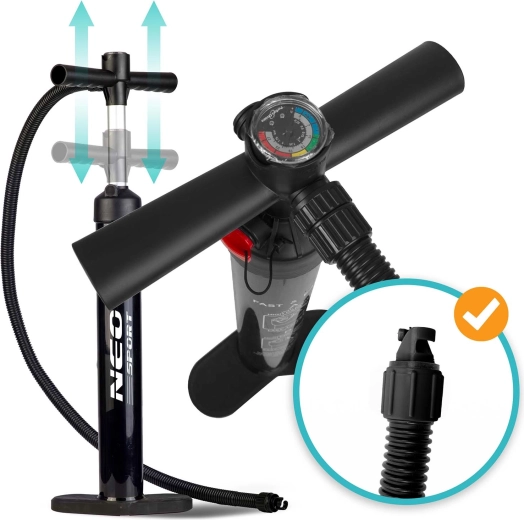 Kompletny set pozwala ruszyć od razu. Regulowane aluminiowe wiosło 162–210 cm, dwukierunkowa pompka z manometrem, linka bezpieczeństwa na nogę oraz wytrzymały plecak transportowy.