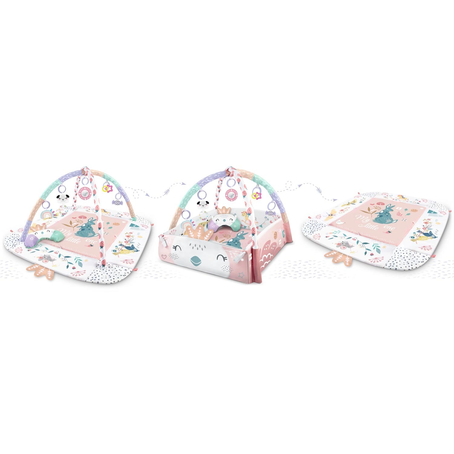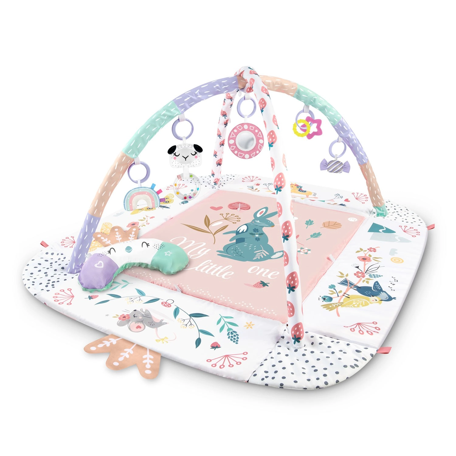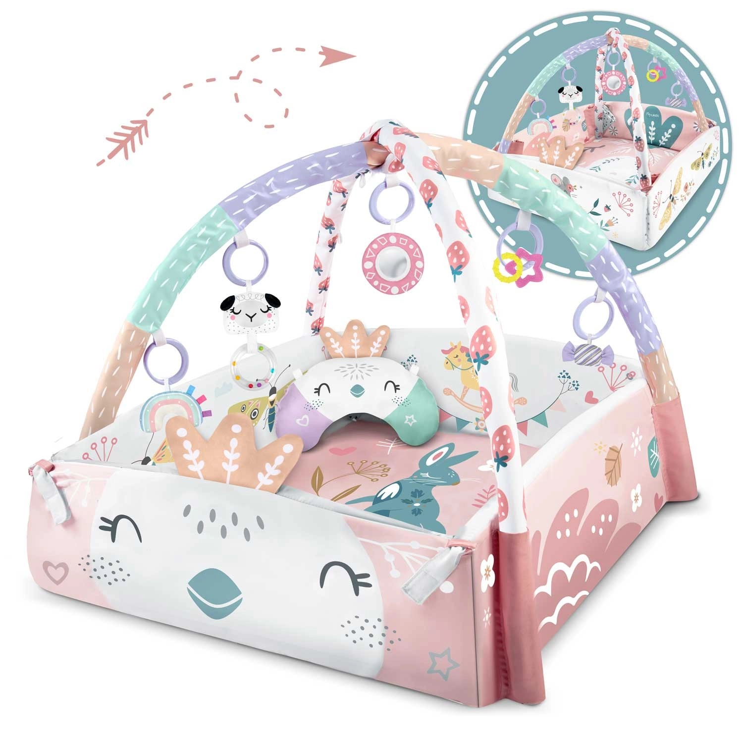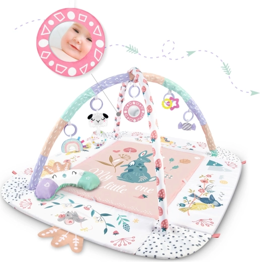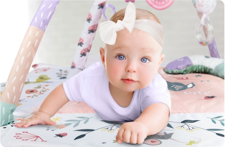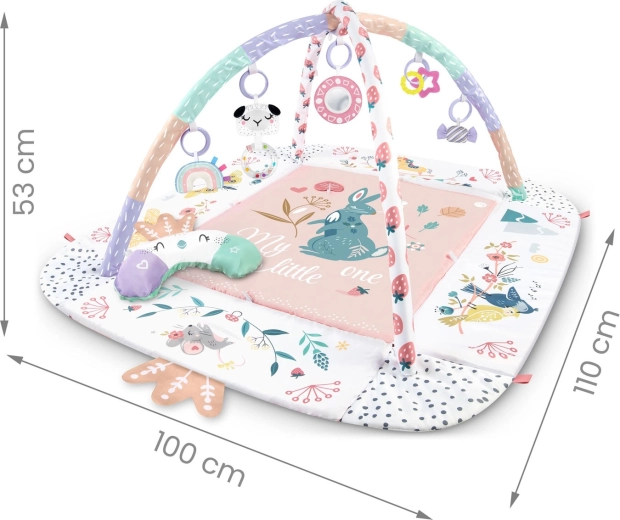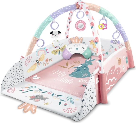 Materiał jest miękki, wytrzymały i łatwy do czyszczenia, a spód świetnie izoluje od chłodu. Pastelowa, dwustronna grafika z motywem zwierzątek tworzy przyjemne środowisko do codziennej zabawy i odpoczynku. Dzięki odpinanym i regulowanym na wysokość pałąkom oraz sprytnym rzepom zabawki można łatwo przekładać i dopasowywać do etapu rozwoju dziecka.