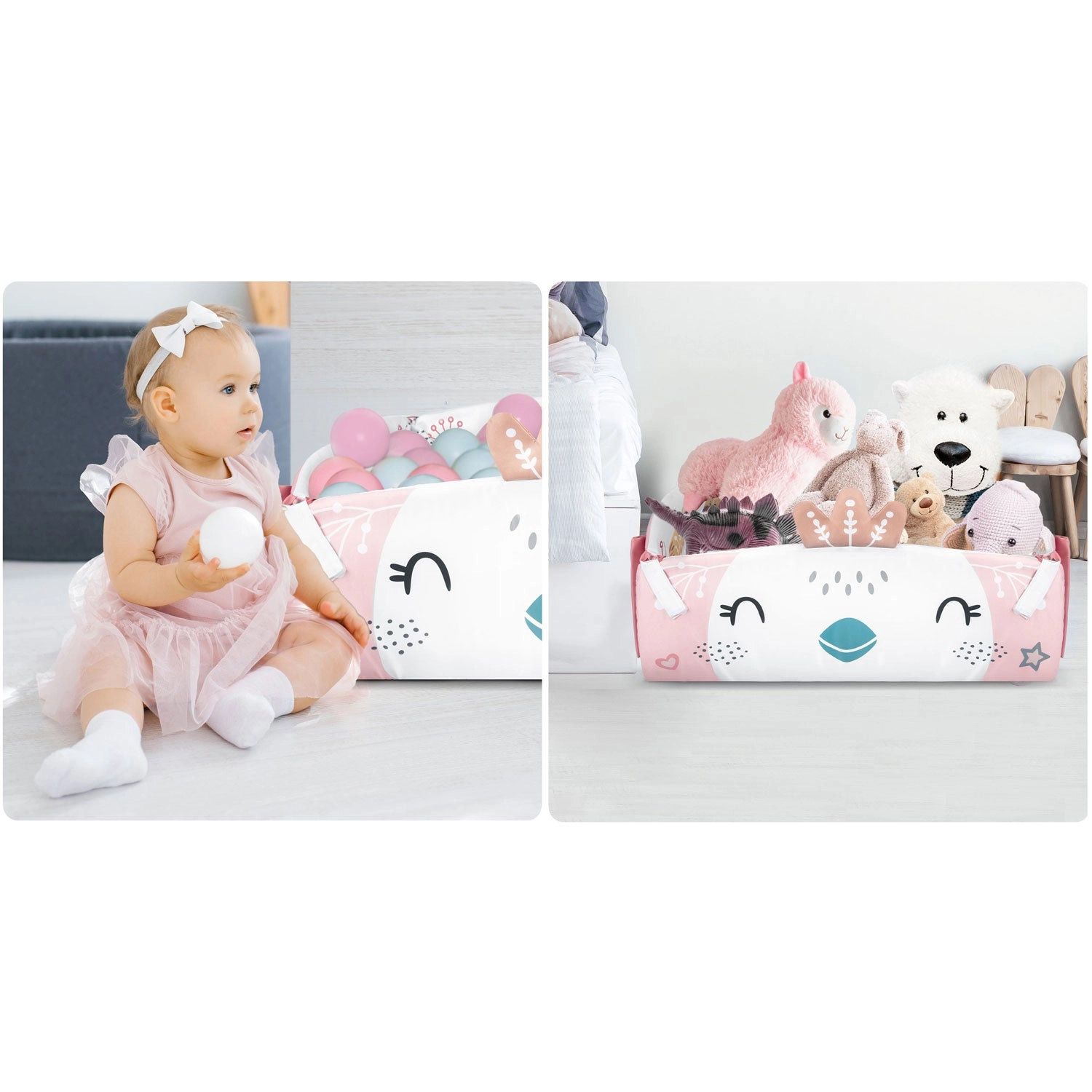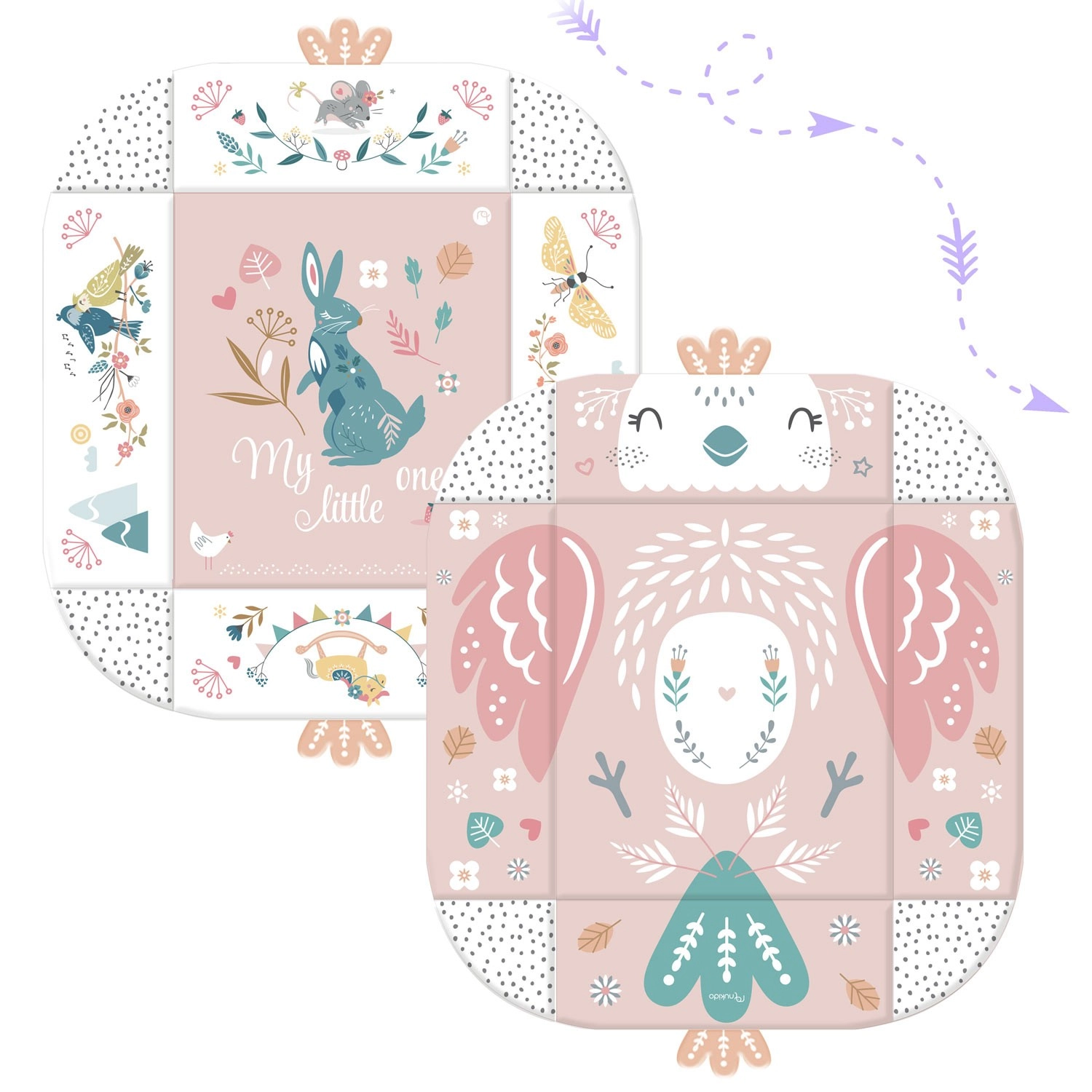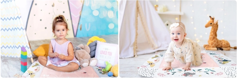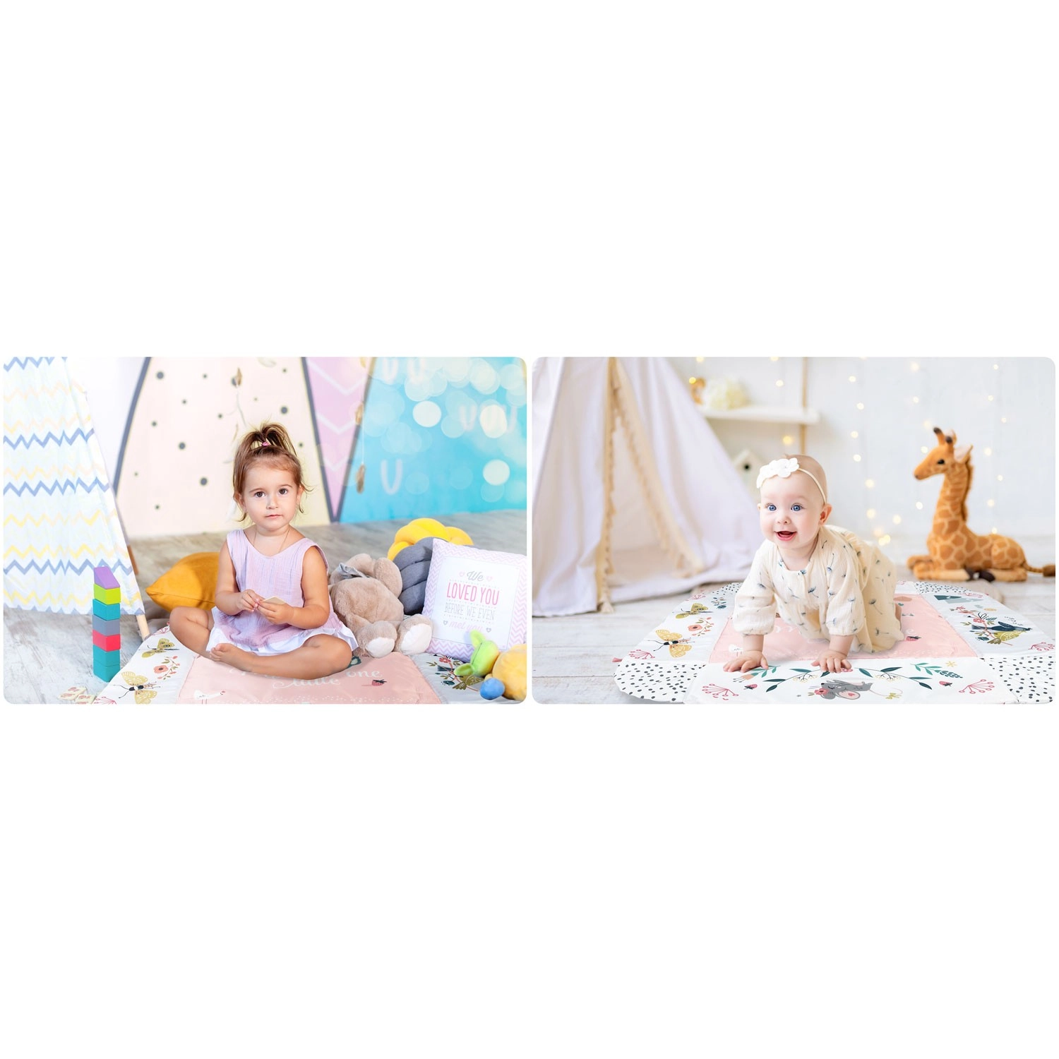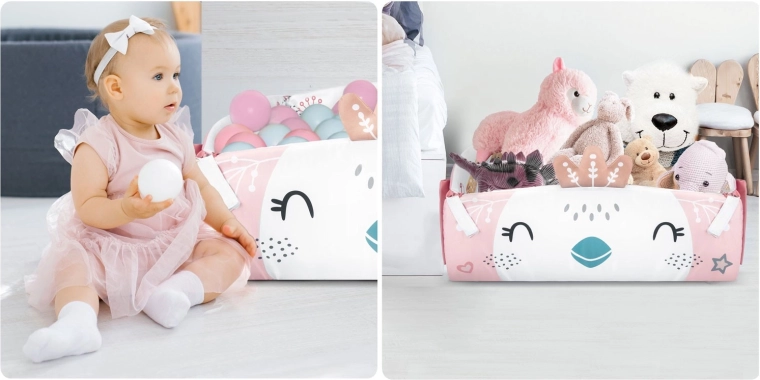 Materiał jest miękki, wytrzymały i łatwy do czyszczenia, a spód świetnie izoluje od chłodu. Pastelowa, dwustronna grafika z motywem zwierzątek tworzy przyjemne środowisko do codziennej zabawy i odpoczynku. Dzięki odpinanym i regulowanym na wysokość pałąkom oraz sprytnym rzepom zabawki można łatwo przekładać i dopasowywać do etapu rozwoju dziecka.