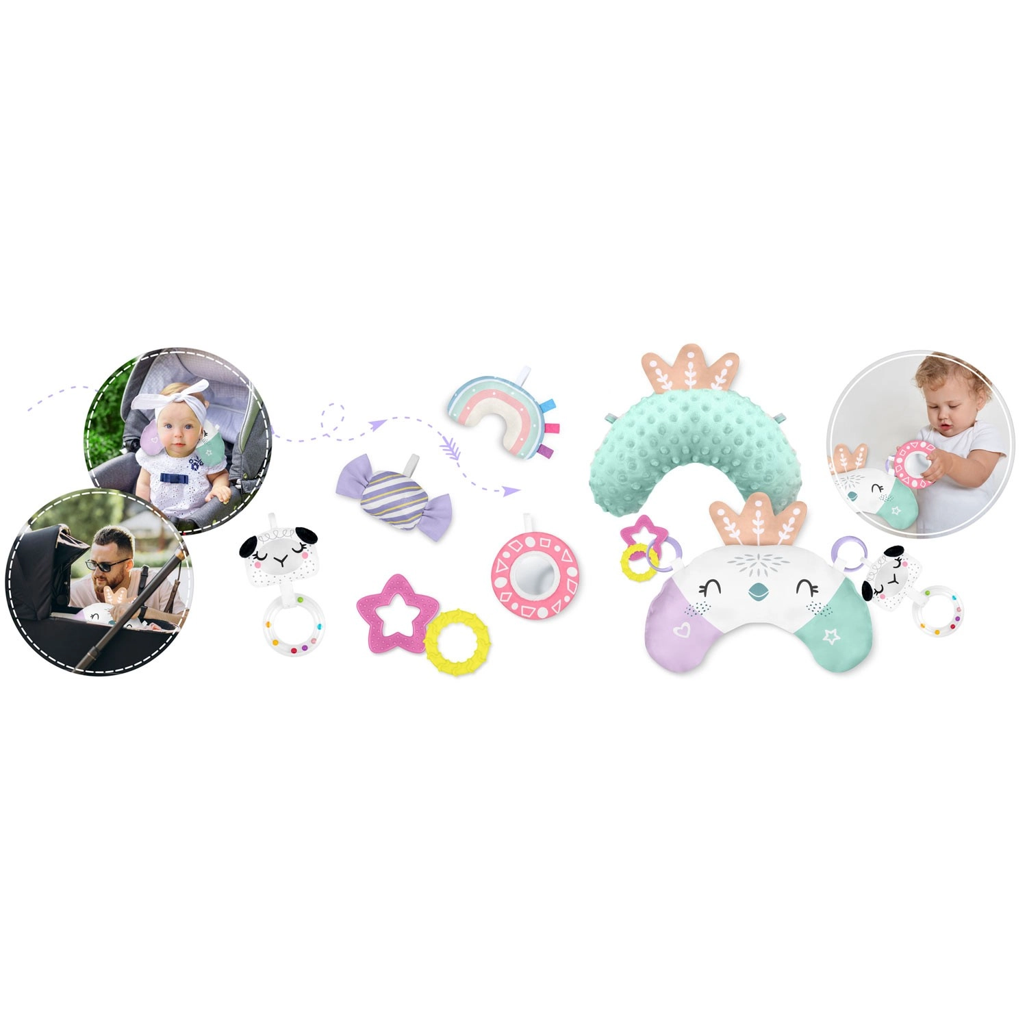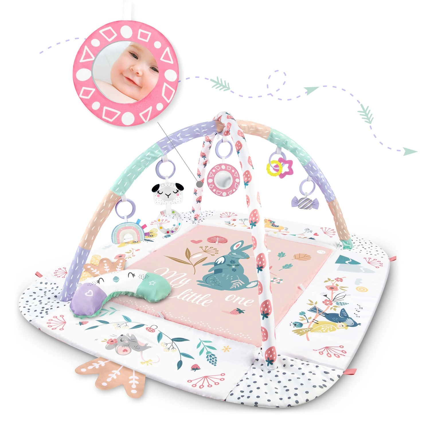 Lusterko z bezpiecznego, nietłukącego się materiału, grzechotki, szeleszczące elementy, piszcząca owieczka i gryzaki rozwijają wzrok, słuch, dotyk oraz chwyt.