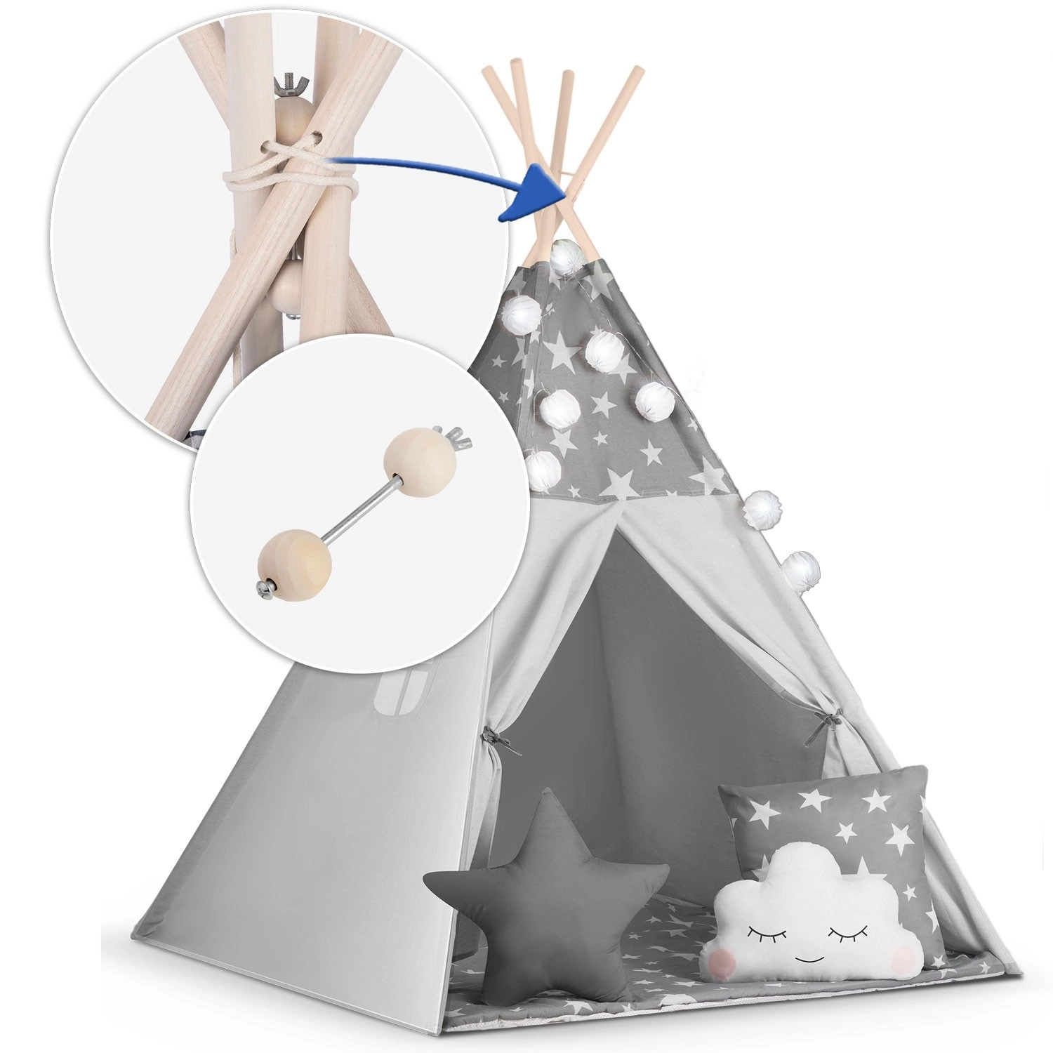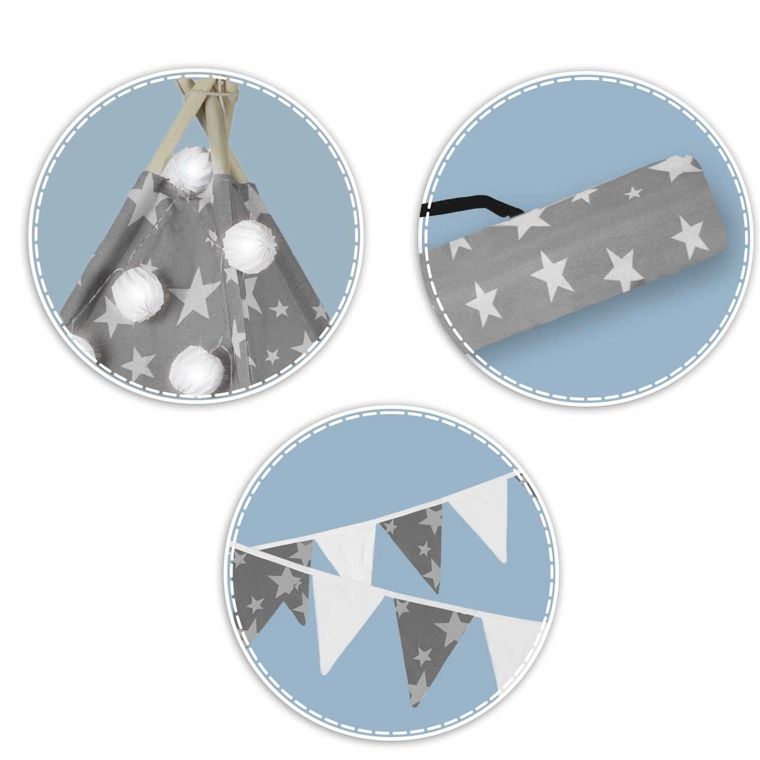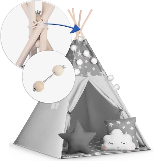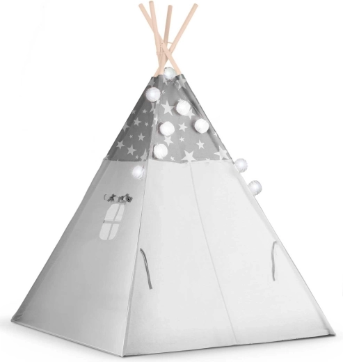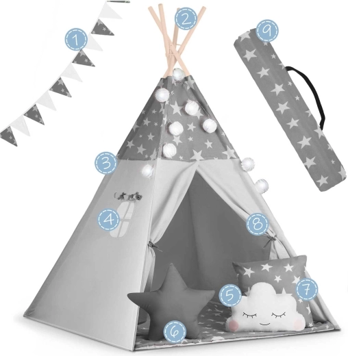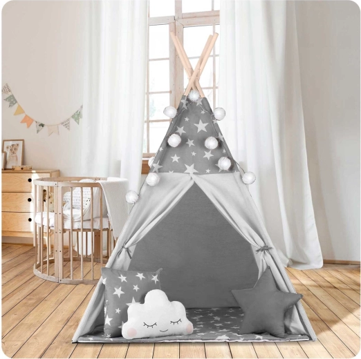 Stwórz dzieciom ich własny przytulny kącik z tipi NUKIDO. Ten stylowy namiot w delikatnym szarym kolorze w gwiazdki uszyto z premium bawełny, ma stabilną drewnianą konstrukcję ze stabilizatorem gratis, a w zestawie znajduje się miękka mata izolacyjna, 3 poduszki, girlanda, światełka i pokrowiec transportowy. Łatwo się składa, świetnie wentyluje i idealnie nadaje się do zabawy, czytania i odpoczynku w domu oraz w ogrodzie.