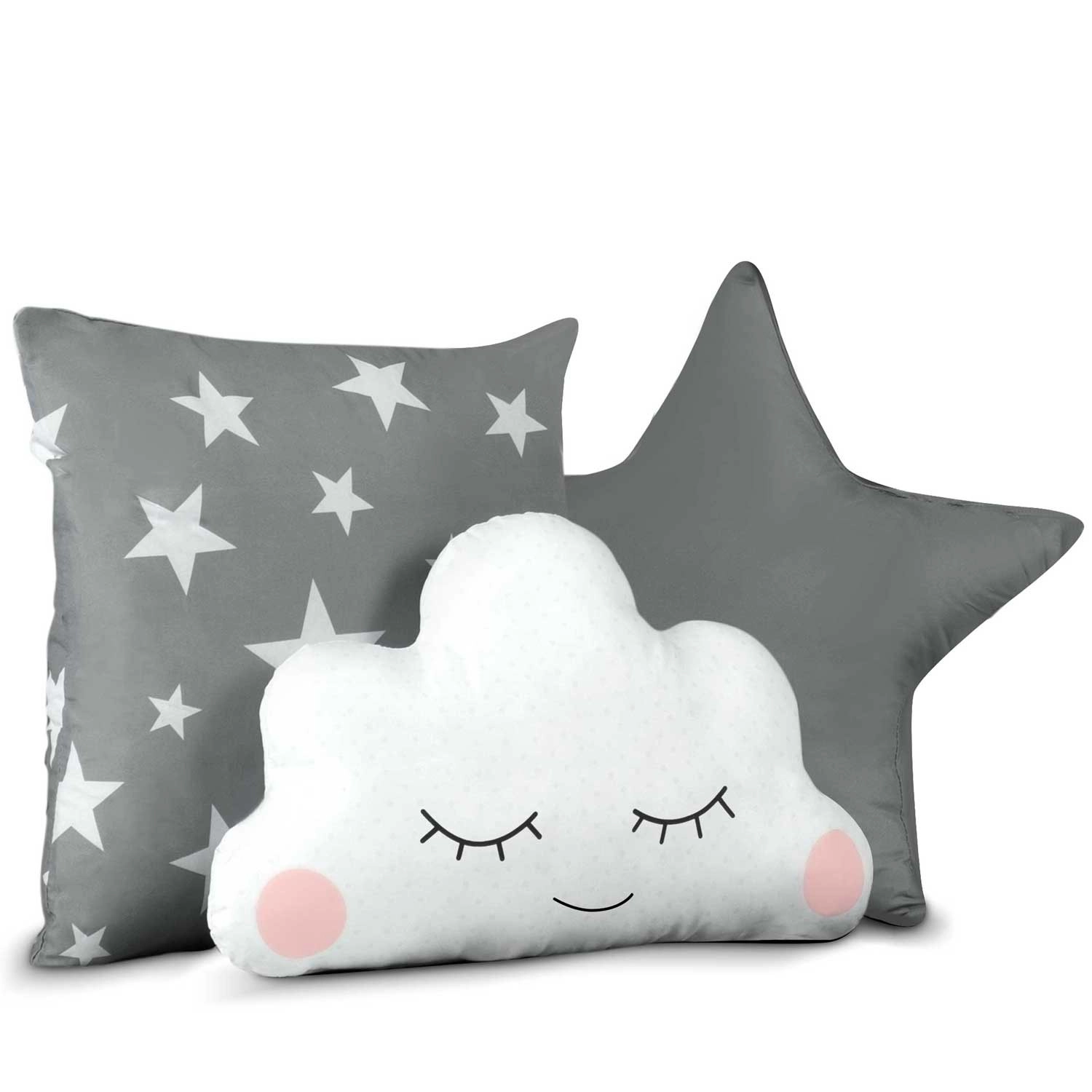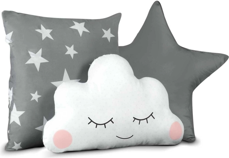 W opakowaniu znajdziesz pikowaną matę, 3 poduszki, lampki LED, girlandę i praktyczny pokrowiec – wszystko w szarości z motywem gwiazdek.