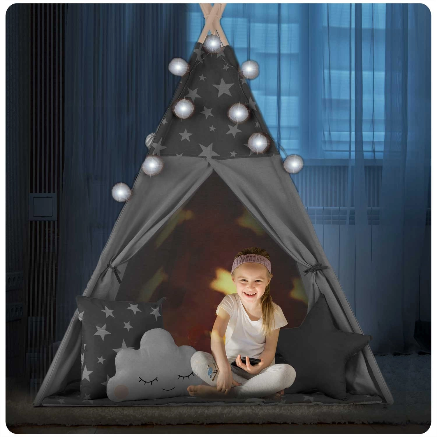 Dla maksymalnego komfortu w zestawie znajduje się pikowana mata izolacyjna z powłoką antypoślizgową oraz trzy dekoracyjne poduszki. O klimat zadbają lampki LED i girlanda, a roletowe okienko i wiązane wejścia pozwolą bawić się przestrzenią i światłem. Po złożeniu tipi zajmuje minimum miejsca, a w dołączonym pokrowcu łatwo je przeniesiesz.