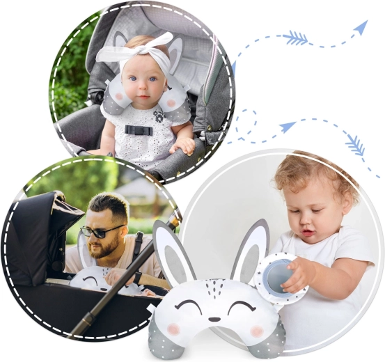 Wysokiej jakości wykonanie oraz trwałe, bezpieczne materiały gwarantują długą żywotność i łatwą pielęgnację. Poduszka jest lekka, poręczna i wielofunkcyjna – idealna do wózka, fotelika samochodowego czy strefy zabawy w domu. Spełnia rygorystyczne normy europejskie i jest wyposażona w praktyczne kółeczka do przypięcia dodatkowych ulubionych zabawek.