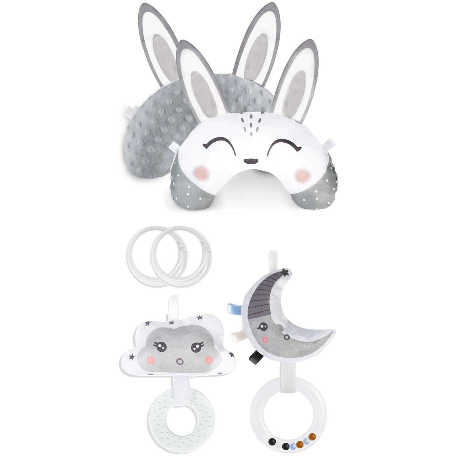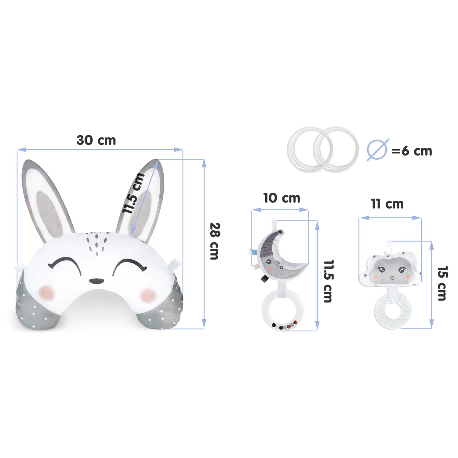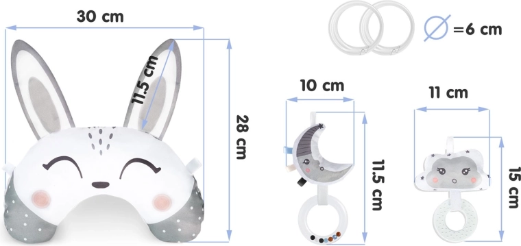 Szeleściąca chmurka z gryzakiem oraz księżyc z grzechotką stymulują słuch, dotyk i wzrok. Plastikowe kółeczka umożliwiają łatwe przypinanie i wymianę zabawek w zależności od potrzeb.