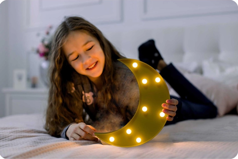 Ciepłe diody LED zapewniają przyjemne, nieoślepiające oświetlenie, które daje dzieciom poczucie bezpieczeństwa, a dorosłym nie zakłóca odpoczynku.
