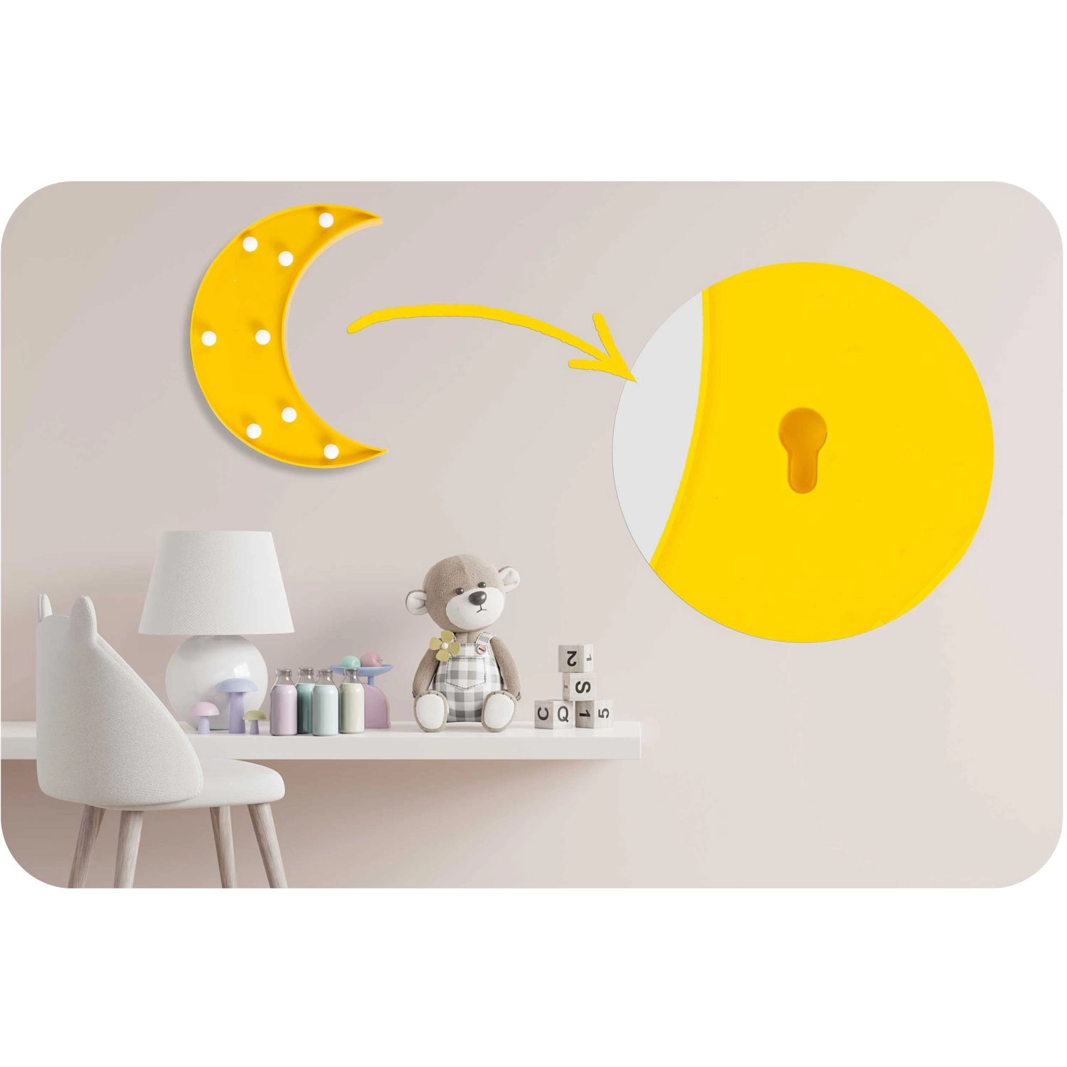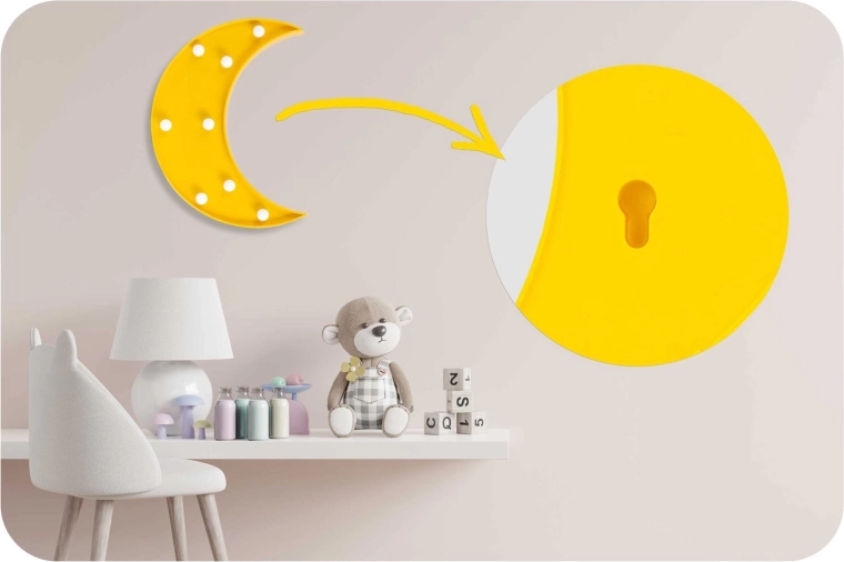 Montaż to pestka: lampkę można ustawić na półce lub dzięki otworowi do zawieszenia umieścić na ścianie. Minimalistyczny kształt półksiężyca w intensywnym żółtym kolorze dopełni zarówno nowoczesne, jak i radosne wnętrza, sprawiając radość przedszkolakom i nastolatkom.