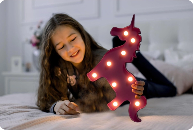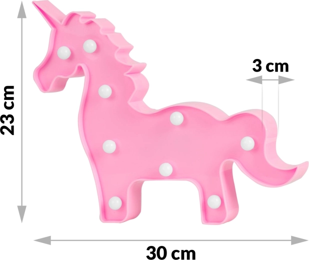 Nocna lampka LED jednorożec NUKIDO to zabawny dodatek do pokoju dziecięcego, łączący uroczy design z praktyczną funkcjonalnością. Miękkie, nieoślepiające światło tworzy przyjemne warunki do zasypiania, czytania i nocnej orientacji. Dzięki zasilaniu bateryjnemu 2x AA lampkę łatwo przeniesiesz wszędzie – na stolik nocny, półkę, a nawet do dziecięcego tipi.