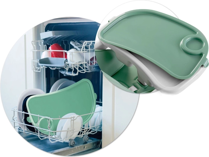 Tacka z podwyższoną krawędzią i oddzielną wkładką zatrzymuje okruszki i rozlane napoje. Można ją zdjąć i umyć pod bieżącą wodą lub w zmywarce.