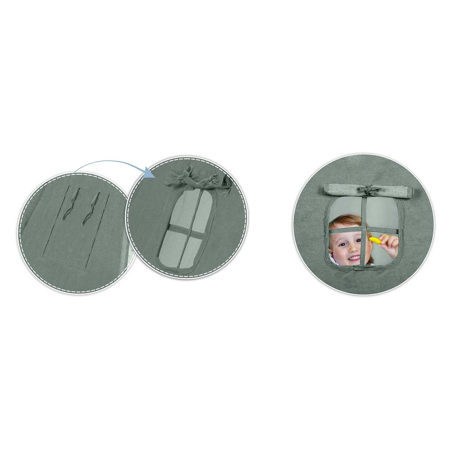 Okienko z roletką i tasiemkami do wiązania umożliwia wietrzenie, zabawę w chowanego i wyglądanie na zewnątrz. Zasłony drzwiowe łatwo zwiążesz, by zapewnić wygodne wejście.