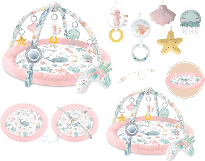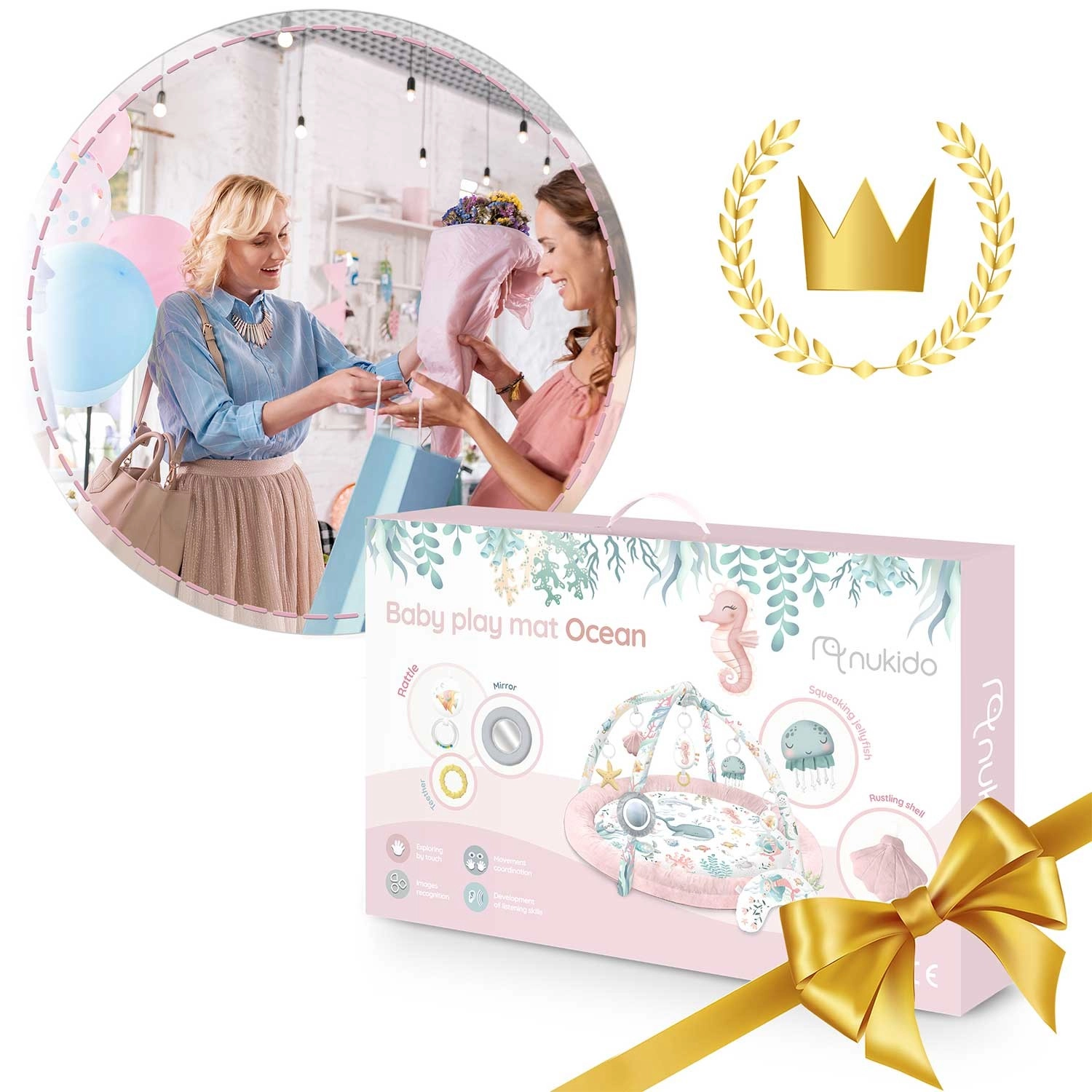 Mata do zabawy Nukido Ocean – różowa tworzy przytulne i bezpieczne środowisko do codziennej zabawy i odpoczynku. Odpinane pałąki z kolorowymi motywami morskiego świata i zawieszkami naturalnie wspierają rozwój wzroku, dotyku i motoryki. Dzięki miękkiej, wytrzymałej i łatwej w czyszczeniu powierzchni mata jest gotowa na codzienne przygody.