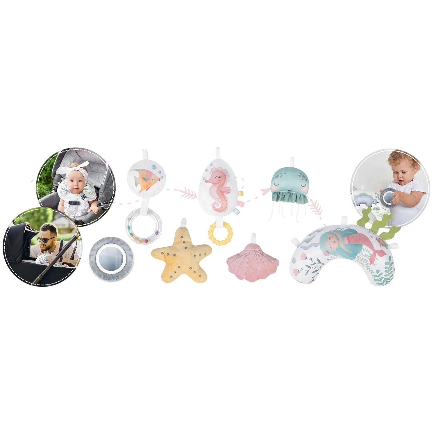 • 7 elementów do zabawy: lusterko do wizualnego odkrywania, szeleszczące i piszczące części, grzechotki oraz tekstylne zabawki z kółeczkami.